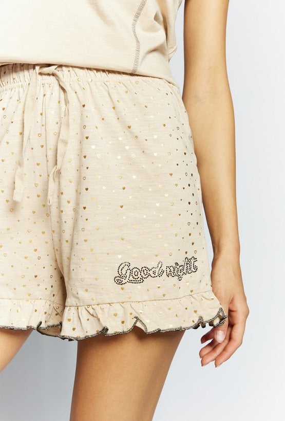 Krótkie spodenki od piżamy wykończone falbanką oraz ozdobnymi serduszkami. Spodenki w pasie mają elastyczną gumkę wraz z wiązaniem. Model ten polecamy dobrać z pasującą górą z tej samej linii. Kod do góry od piżamy: 23J-PYJ0100-K015 Modelka na zdjęciu ma 177 cm wzrostu i prezentuje rozmiar 36.