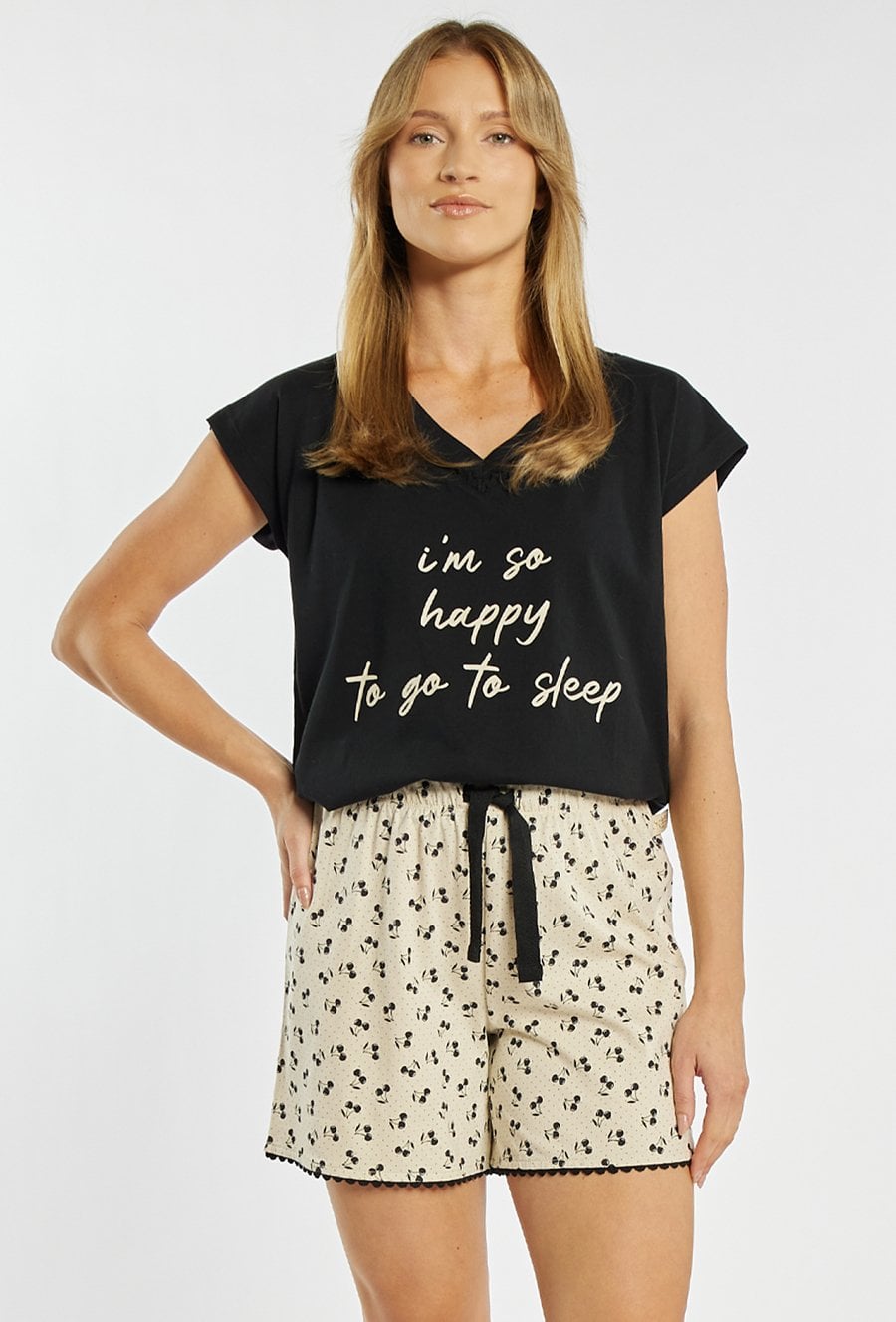 Szorty od piżamy damskiej o wygodnym, swobodnym kroju. Model z elastycznym pasem oraz wiązaniem w talii, które pozwala na lepsze dopasowanie do sylwetki. Całość zdobi delikatny, drobny wzór oraz kontrastowe wykończenie przy nogawkach, nadające spodenkom subtelnego charakteru. Modelka na zdjęciu ma 177 cm wzrostu i prezentuje rozmiar S. Można zestawić z pasującymi koszulkami z tej samej kolekcji.