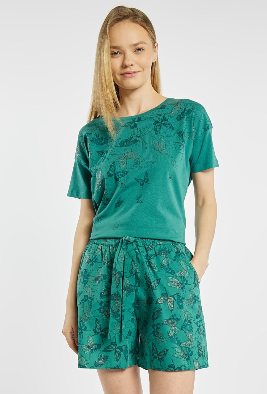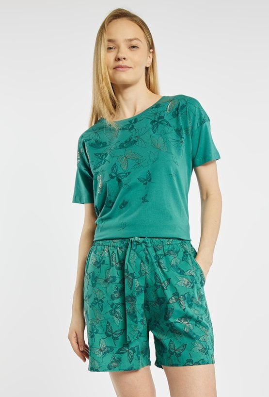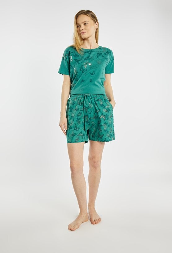Spodenki od piżamy o luźnym, wygodnym kroju, z elastyczną talią i wiązaniem, które pozwala na lepsze dopasowanie. Spodenki z delikatnym wzorem motyli, zapewniają komfort podczas snu i domowego relaksu, tworząc spójny komplet z koszulką piżamową. Modelka na zdjęciu ma 177 cm wzrostu i prezentuje rozmiar S. Kody do kompletu: