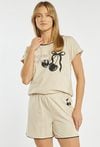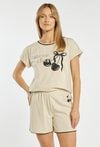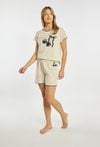 Szorty od piżamy damskiej o wygodnym, swobodnym kroju. Model z elastycznym pasem, który zapewnia komfortowe dopasowanie do sylwetki. Nogawki wykończone są subtelną, kontrastową lamówką, nadającą całości delikatnego i kobiecego charakteru. Z boku znajduje się niewielki nadruk, który stanowi dyskretną ozdobę modelu. Modelka na zdjęciu ma 177 cm wzrostu i prezentuje rozmiar S. Można zestawić z pasującymi koszulkami z tej samej kolekcji.