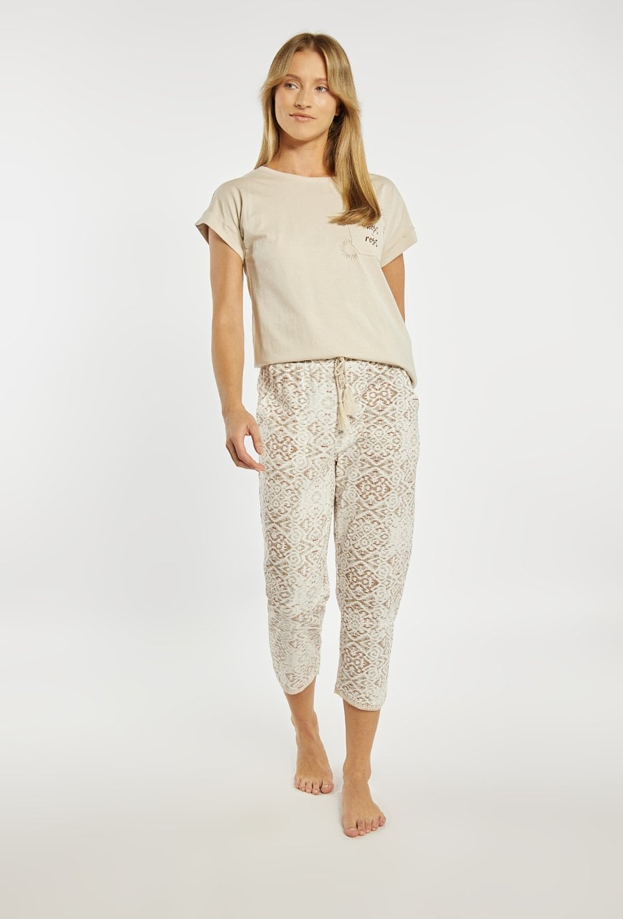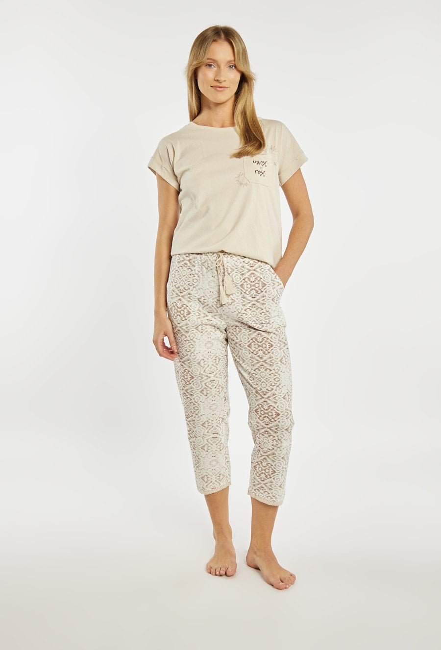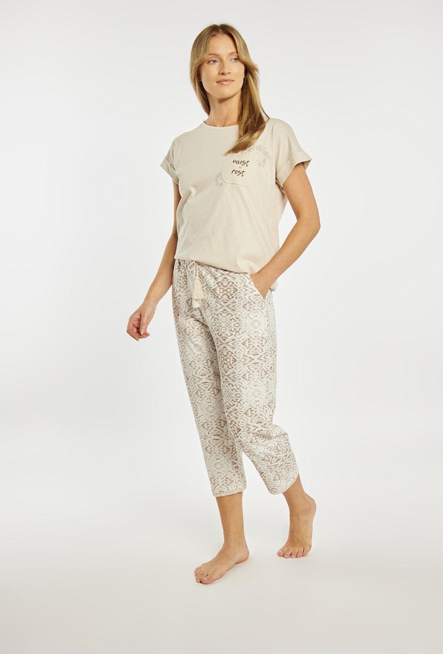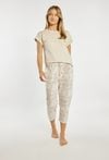 Spodnie od piżamy damskiej o wygodnym, swobodnym kroju. Model o długości 7/8, z elastycznym pasem oraz wiązaniem w talii, które pozwala na idealne dopasowanie do sylwetki. Wzór w subtelny, dekoracyjny print. Modelka na zdjęciu ma 177 cm wzrostu i prezentuje rozmiar S. Można zestawić z pasującymi koszulkami od piżam.