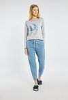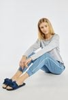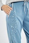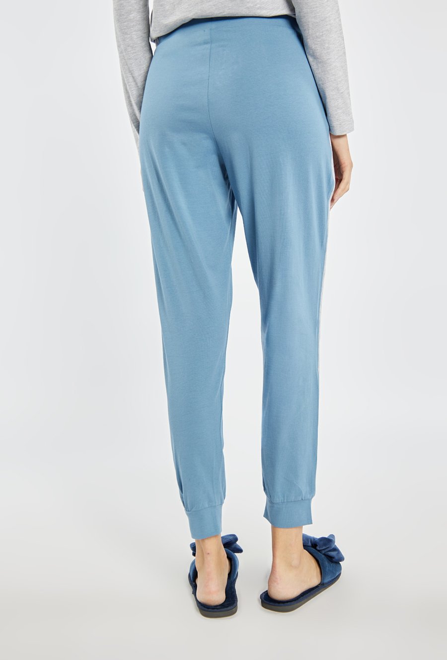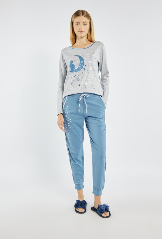 Spodnie od piżamy z elastyczną talią regulowaną sznurkiem oraz ściągaczami przy nogawkach. Po bokach zdobiony nadrukiem z motywem drobnych gwiazdek, który dodaje całości subtelnego, nocnego charakteru. Idealne do stworzenia kompletu z koszulką w tym samym stylu. Modelka na zdjęciu ma 177 cm wzrostu i prezentuje rozmiar S. Kody do stworzenia kompletu: PYJIMP0-25Z-PYJ0950-K018 PYJIMP0-25Z-PYJ0941-K012 PYJIMP0-25Z-PYJ0940-KM18 PYJIMP0-25Z-PYJ0910-KM18 PYJIMP0-25Z-PYJ0920-K018