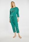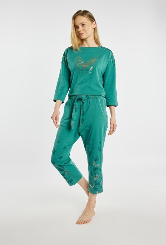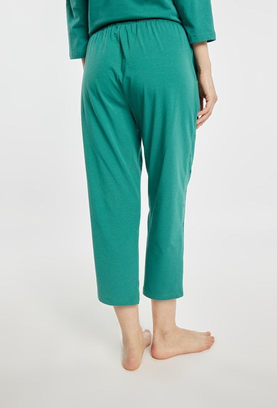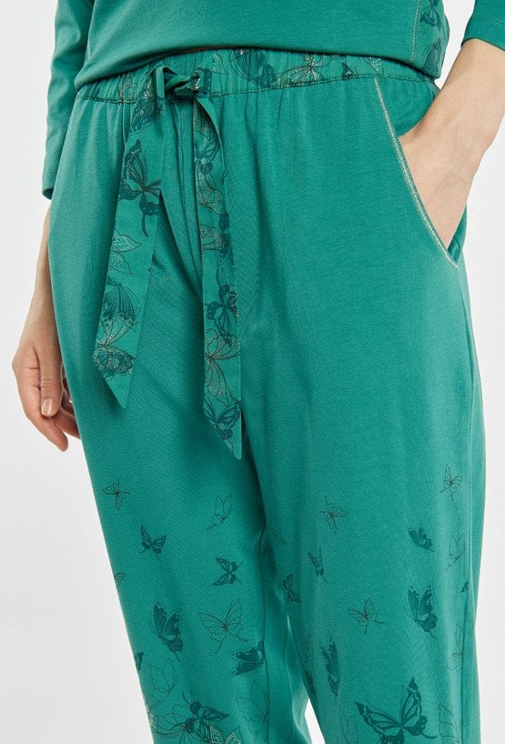 Spodnie od piżamy o długości 7/8, z prostą, luźną nogawką zapewniającą swobodę ruchów. W pasie elastyczna gumka oraz troczek do regulacji, a całość zdobi delikatny wzór. Spodnie idealnie pasują do koszulki z tej samej piżamowej kolekcji. Modelka na zdjęciu ma 177 cm wzrostu i prezentuje rozmiar S. Kody do kompletu: