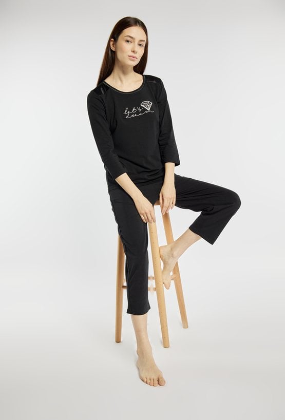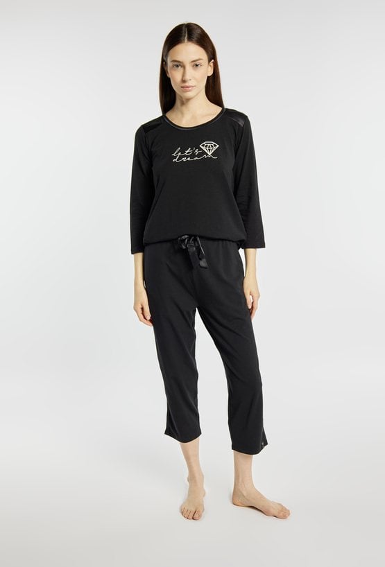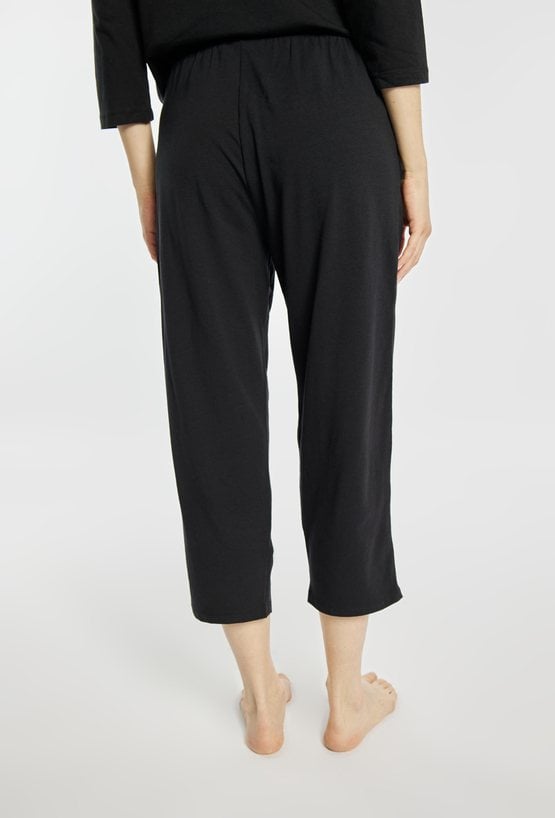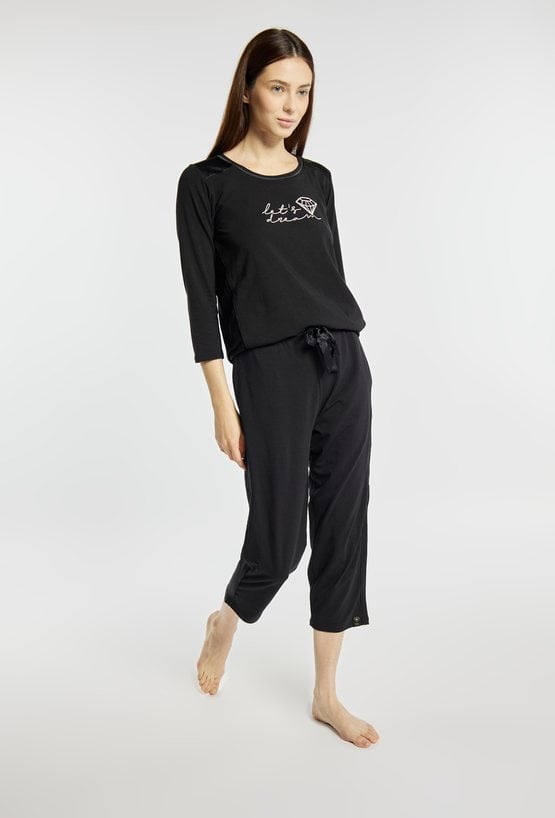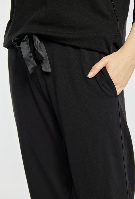 Spodnie od piżamy mają długość 7/8 i prostą nogawkę. Spodnie wykonane są z miękkiego, przyjemnego w dotyku materiału, mają wygodną gumkę w pasie z satynową wstążką oraz subtelne, małe rozcięcia na dole nogawek. Modelka na zdjęciu ma 177 cm wzrostu i prezentuje rozmiar S.