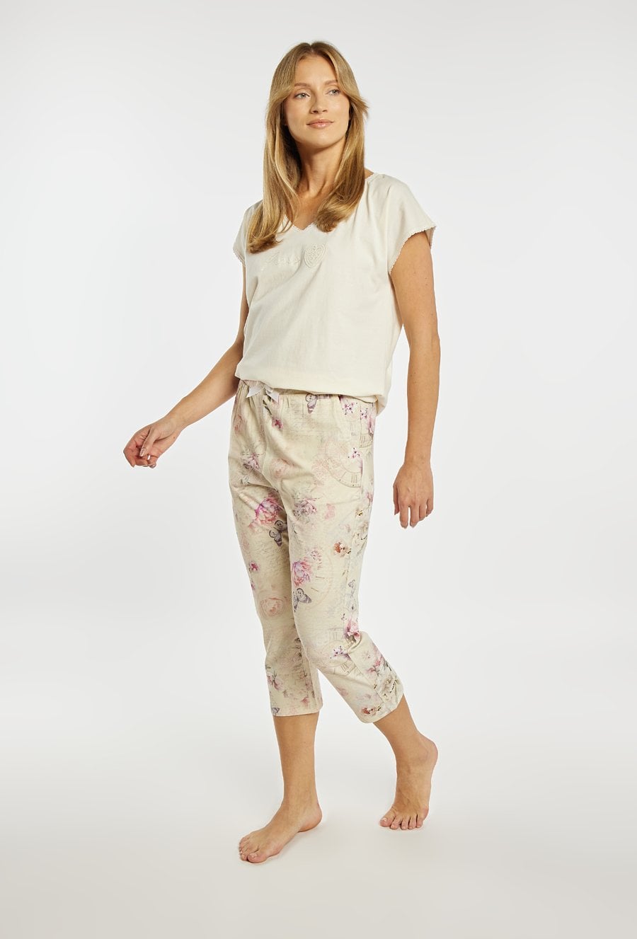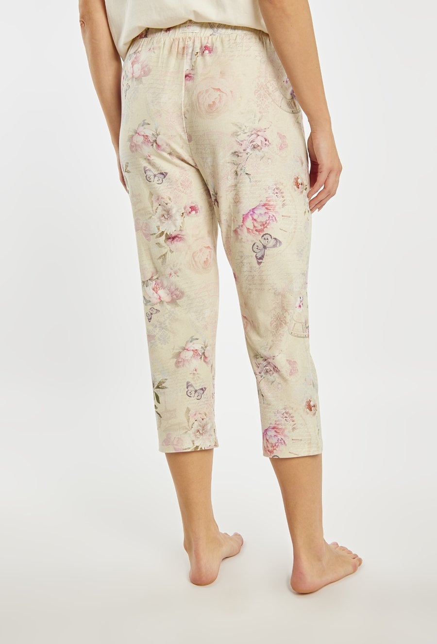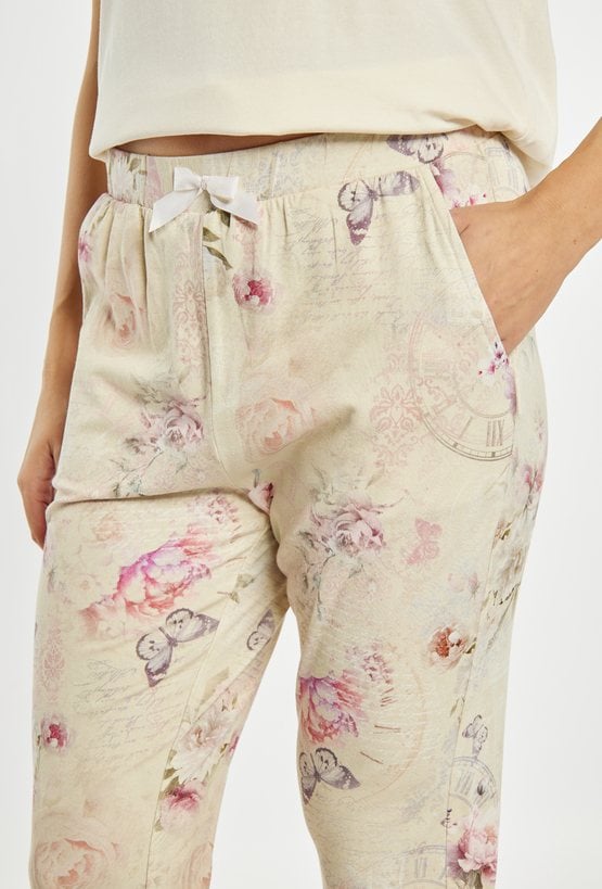 Spodnie od piżamy damskiej o wygodnym, swobodnym kroju. Model o długości 7/8 z elastycznym pasem, który zapewnia komfortowe dopasowanie do sylwetki. Całość zdobi delikatny, romantyczny wzór z motywem kwiatów i motyli, nadający spodniom subtelnego, kobiecego charakteru. Modelka na zdjęciu ma 177 cm wzrostu i prezentuje rozmiar S. Można zestawić z pasująca koszulką od piżamy z tej samej kolekcji.