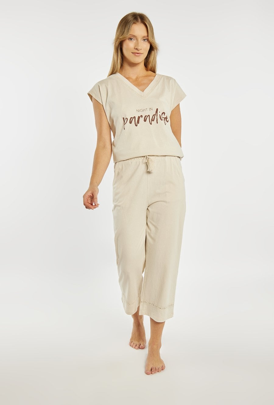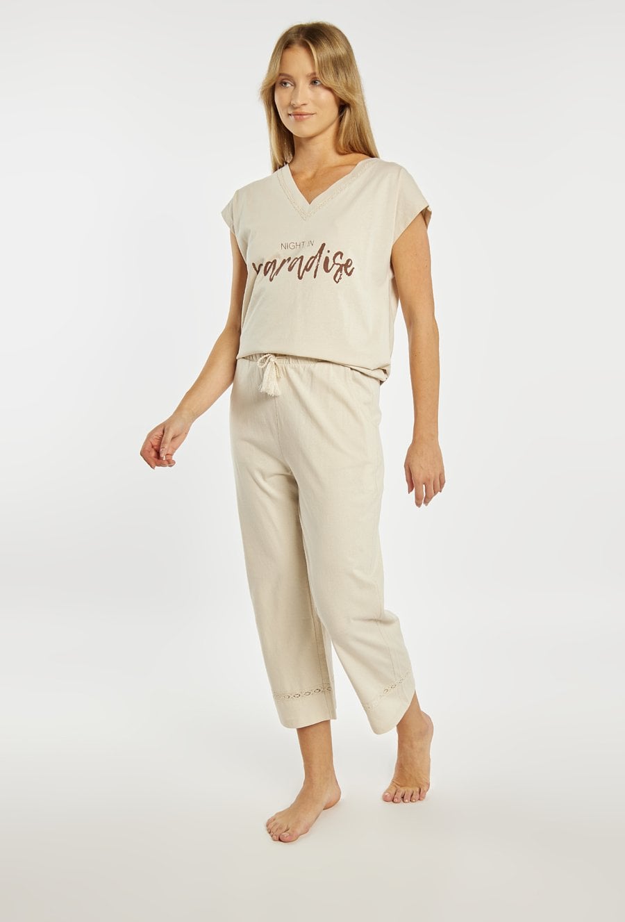 Spodnie od piżamy damskiej o wygodnym, swobodnym kroju. Model o długości 7/8 z elastycznym pasem oraz wiązaniem w talii, które pozwala na komfortowe dopasowanie do sylwetki. Modelka na zdjęciu ma 177 cm wzrostu i prezentuje rozmiar S. Można zestawić z pasującymi koszulkami od piżam.