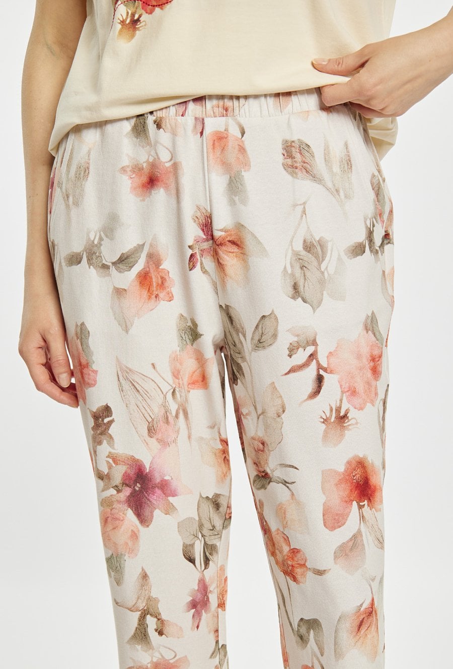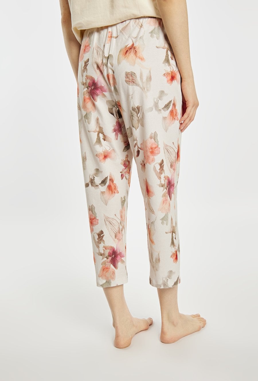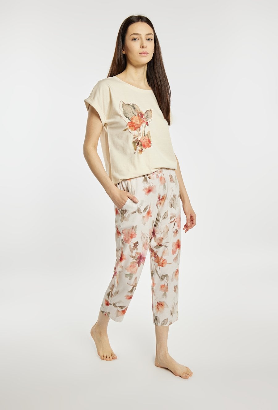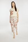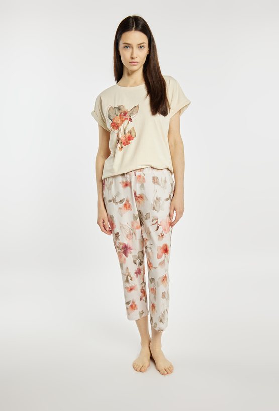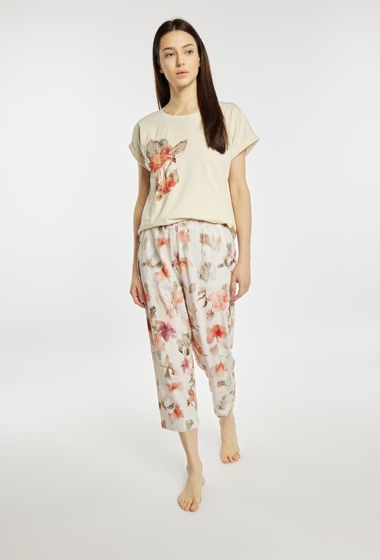Spodnie damskie od piżamy o luźnym, komfortowym kroju z nogawką o długości 7/8. Model z elastycznym pasem. Całość zdobi subtelny, kwiatowy wzór, nadający im delikatnego, kobiecego charakteru. Modelka na zdjęciu ma 177 cm wzrostu i prezentuje rozmiar S. Polecamy zestawić z koszulkami z tej samej kolekcji. Pasujące kody: