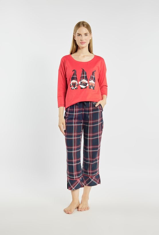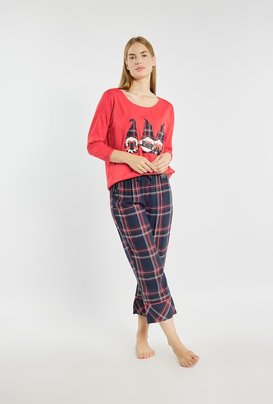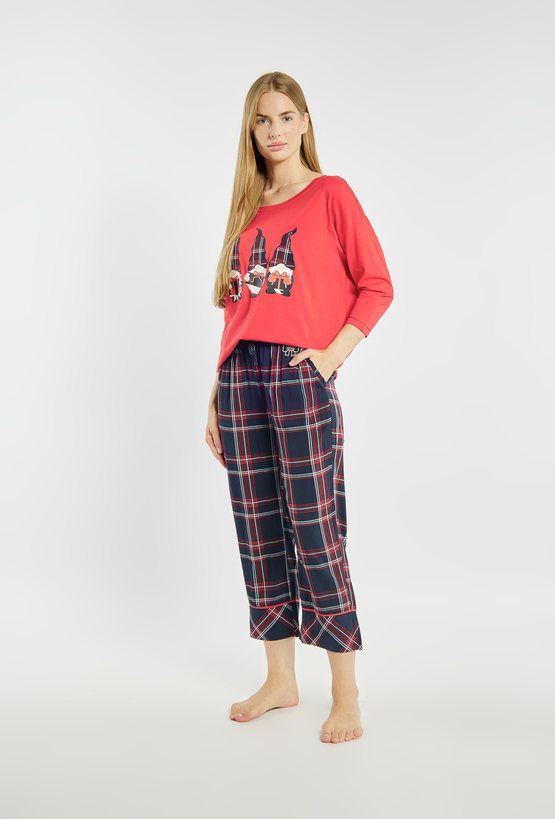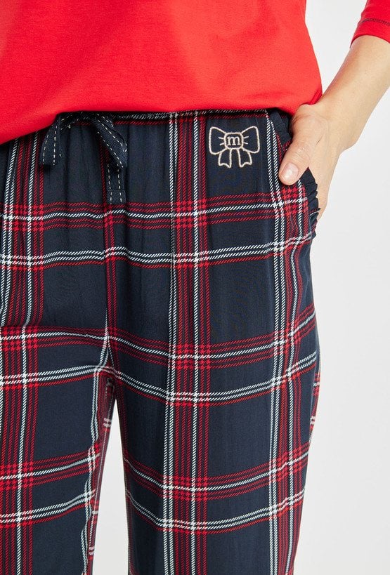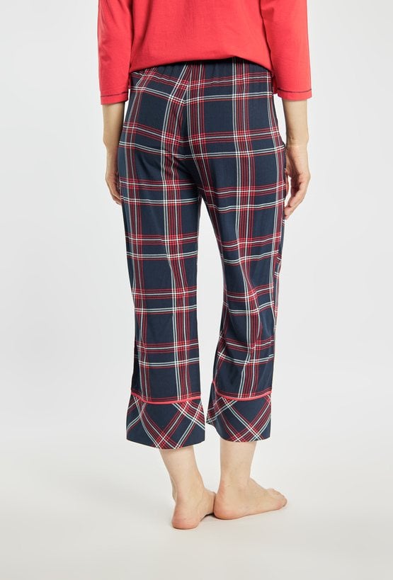 Spodnie od piżamy w klasyczną kratę o nogawce długości 7/8. Elastyczna talia z troczkiem umożliwia idealne dopasowanie, a praktyczne kieszenie dodają funkcjonalności. Stylowy wzór w kratę nadaje im ciepłego, świątecznego charakteru. Modelka na zdjęciu ma 177 cm wzrostu i prezentuje rozmiar S.