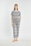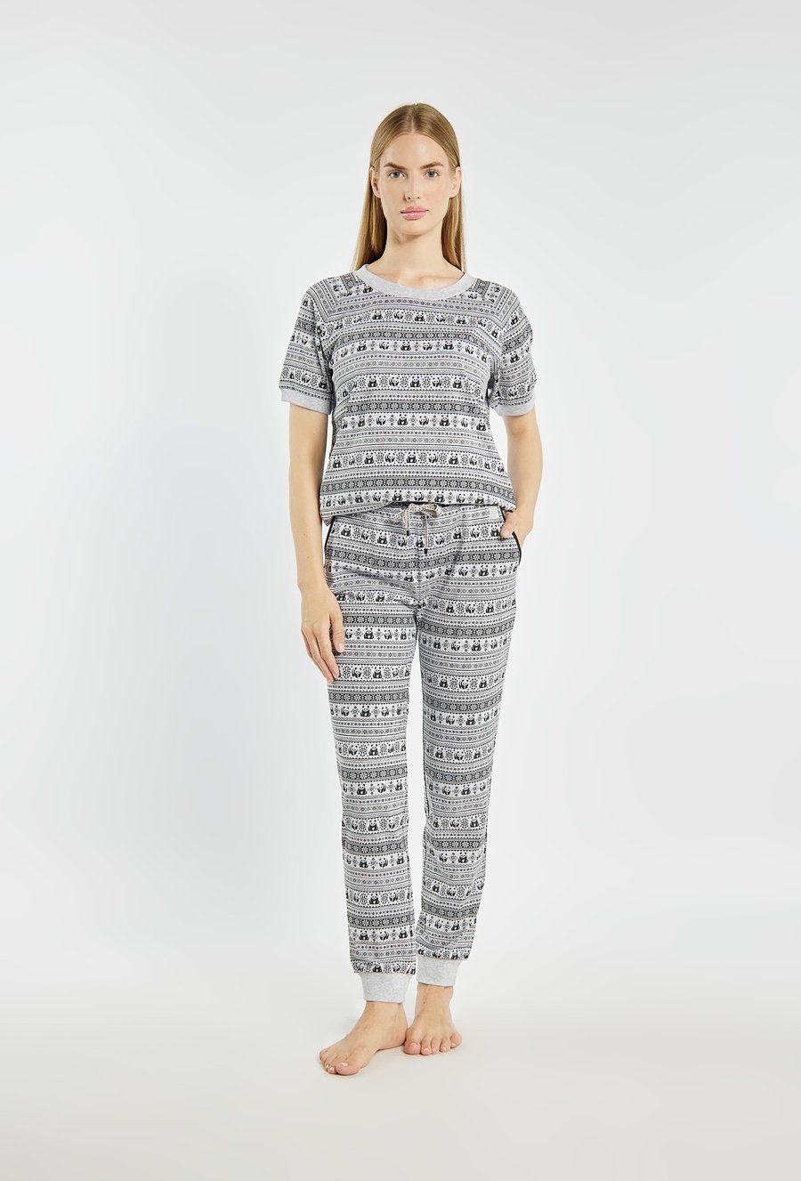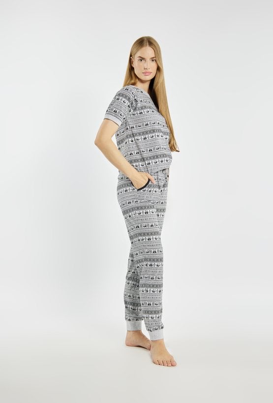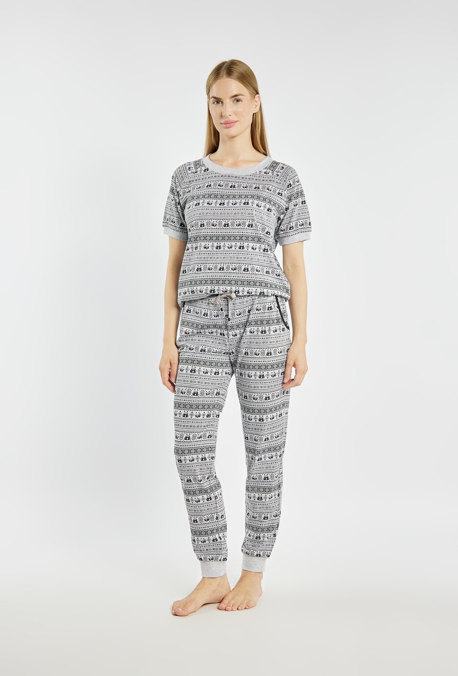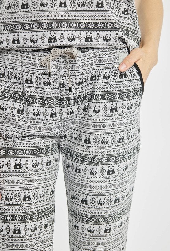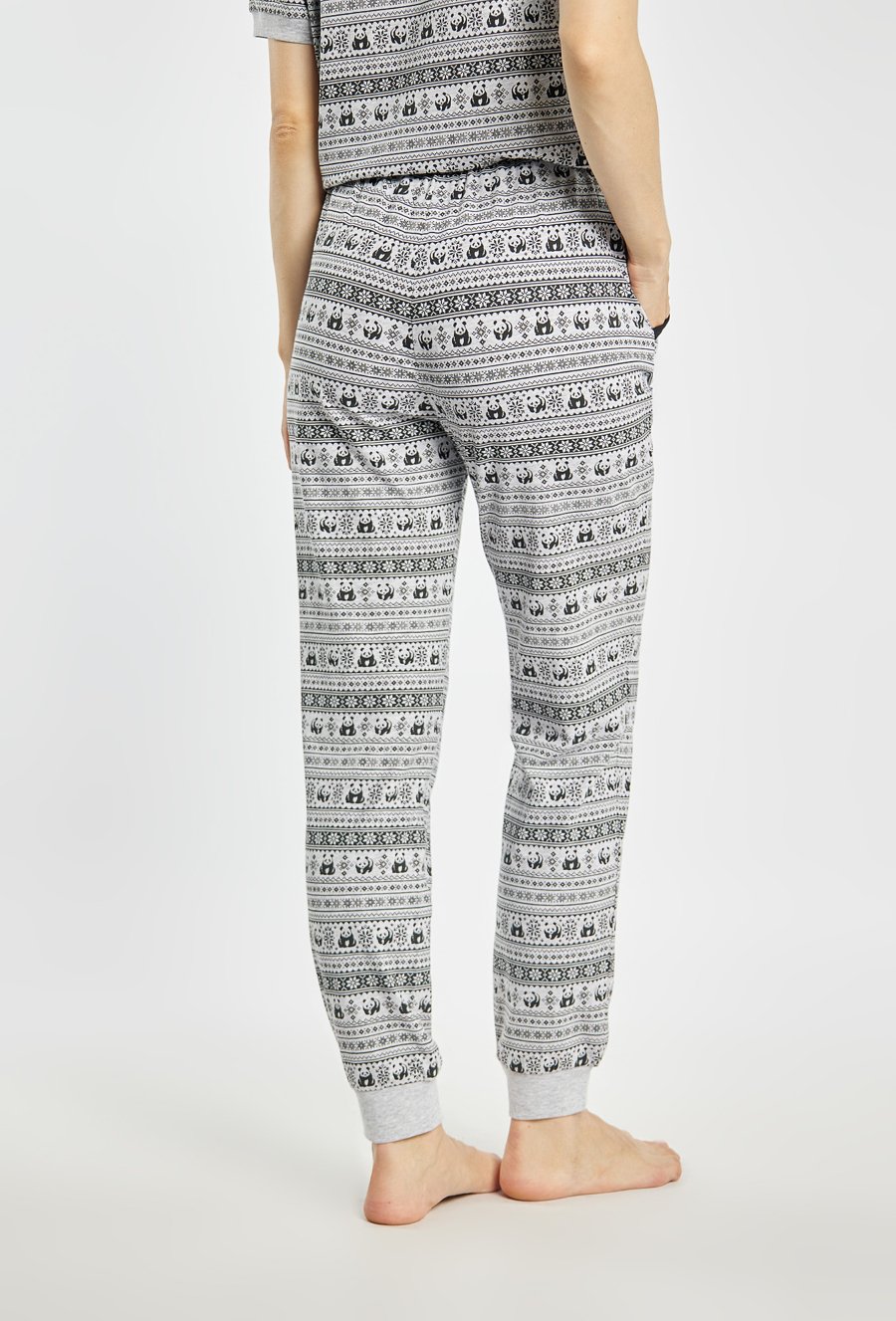 Spodnie damskie od piżamy z uroczym zimowym wzorem w misie i geometryczne motywy. Model z elastyczną talią i troczkiem do regulacji zapewnia idealne dopasowanie. Modelka na zdjęciu ma 177 cm wzrostu i prezentuje rozmiar S.