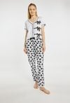 Spodnie od piżamy o prostym, swobodnym kroju, z długą nogawką i elastyczną talią zapewniającą wygodę noszenia. Model wykonany z lekkiego materiału, ozdobiony powtarzalnym wzorem kokardek, tworzy spójny komplet z koszulką piżamową. Modelka na zdjęciu ma 177 cm wzrostu i prezentuje rozmiar S. Możemy zestawić z pasującą górą z tej samej kolekcji: