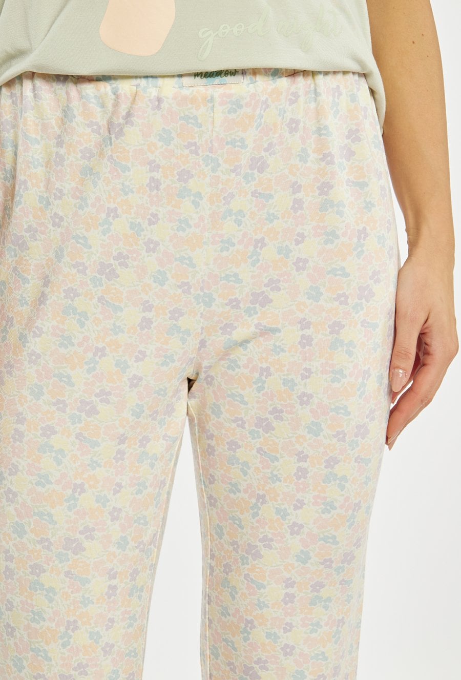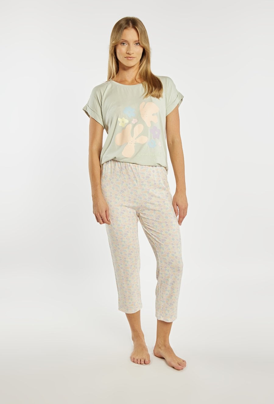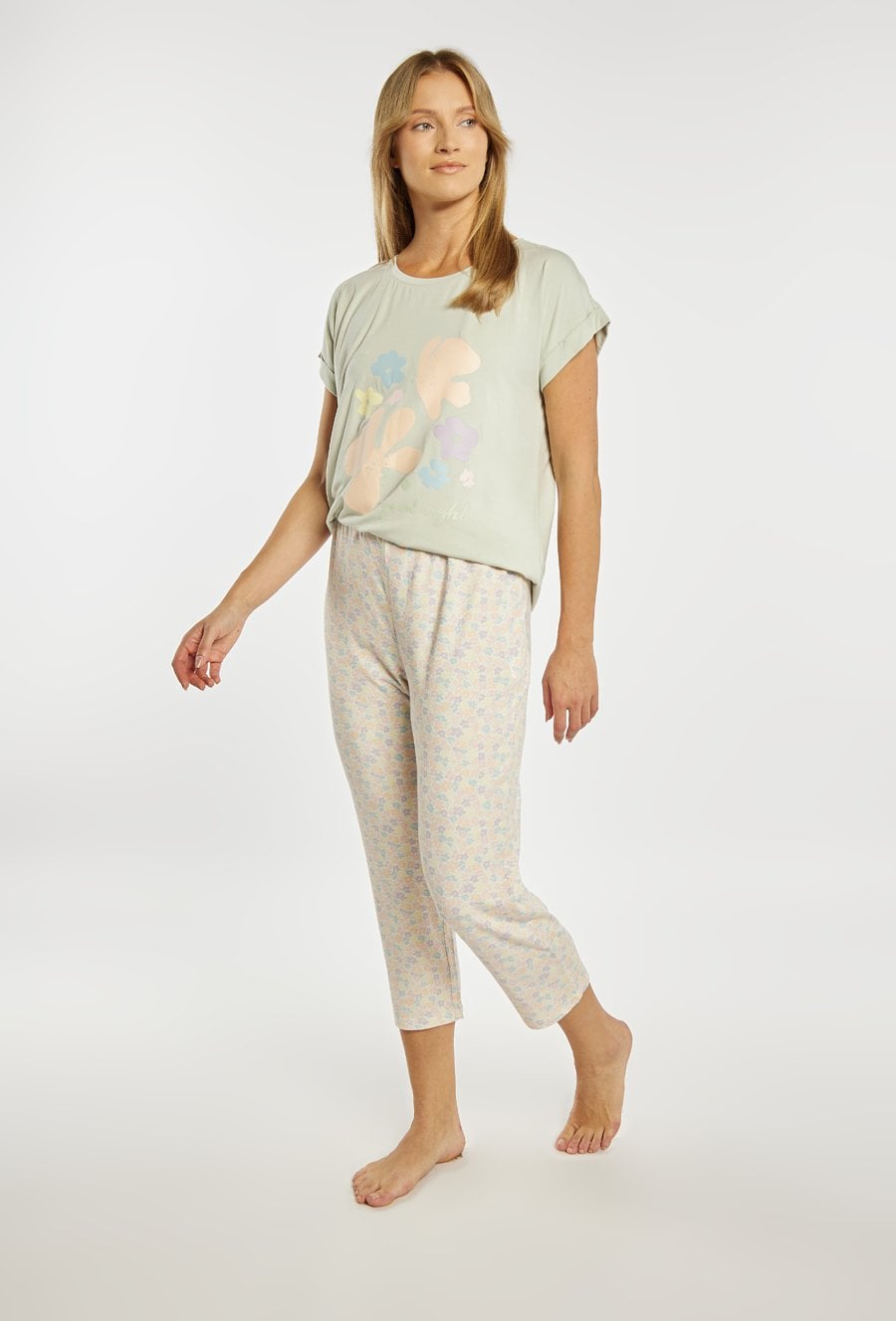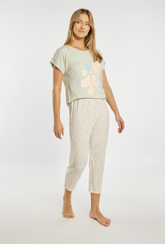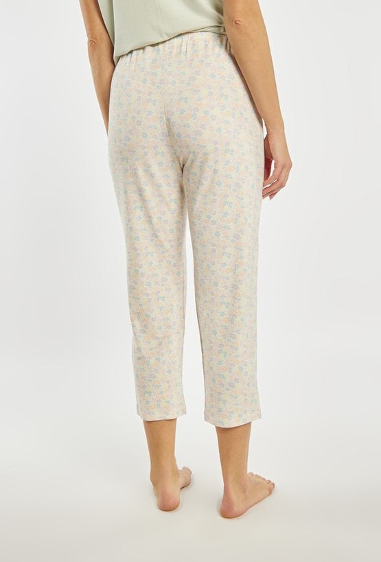 Spodnie od piżamy damskiej o wygodnym, swobodnym kroju. Model o długości 7/8 z elastycznym pasem, który zapewnia komfortowe dopasowanie do sylwetki. Całość zdobi subtelny, drobny wzór w pastelowych kolorach, nadający spodniom lekkiego i kobiecego charakteru. Modelka na zdjęciu ma 177 cm wzrostu i prezentuje rozmiar S. Można zestawić z pasująca koszulką od piżamy z tej samej kolekcji.