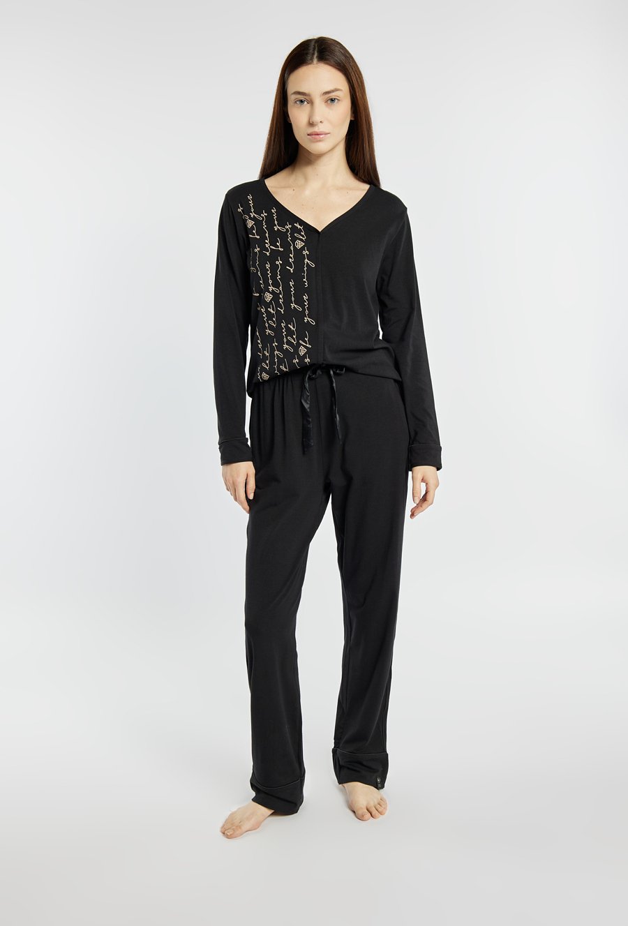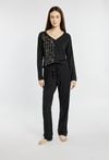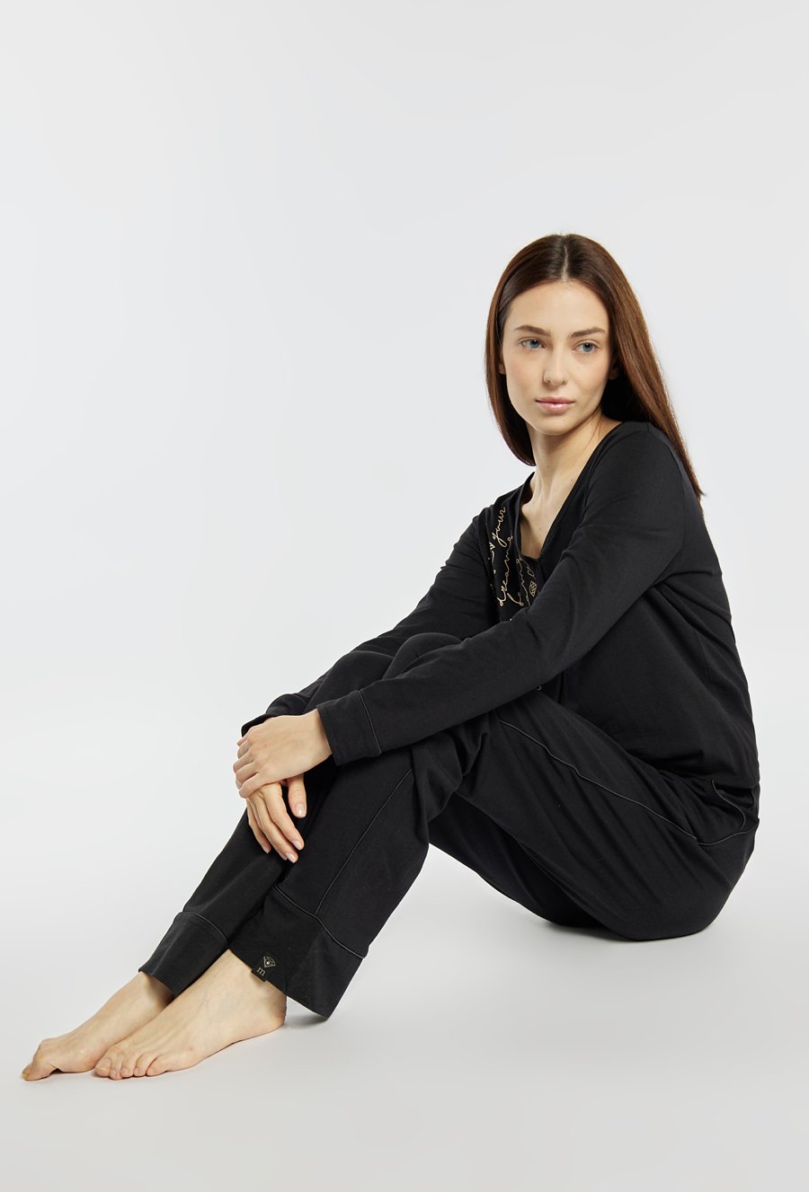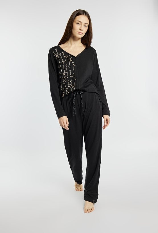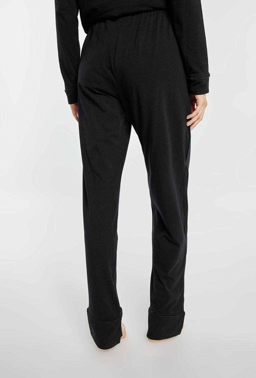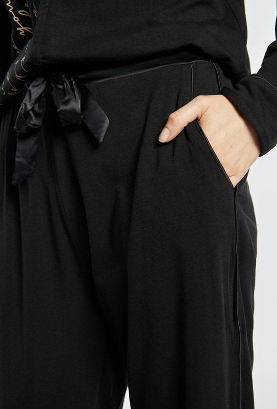 Spodnie od piżamy mają prosty, luźniejszy krój i komfortową gumkę w pasie z ozdobną satynową tasiemką. Spodnie wykonane są z miękkiego, przyjemnego w dotyku materiału i idealnie pasują do koszulki z tej samej kolekcji. Modelka na zdjęciu ma 177 cm wzrostu i prezentuje rozmiar S.