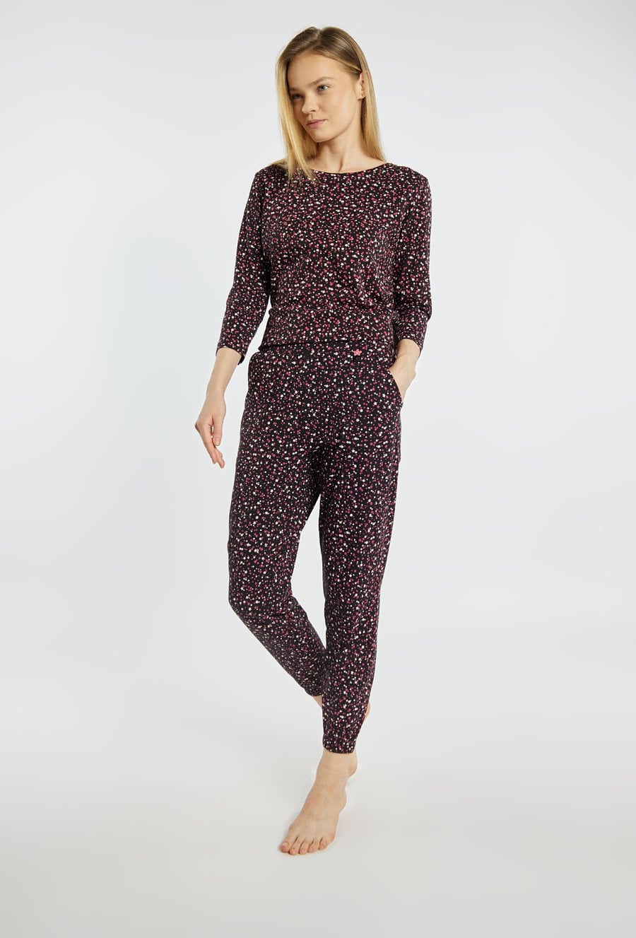 Spodnie od piżamy z długą, zwężaną nogawką, zapewniają komfort podczas snu i domowego wypoczynku. Spodnie mają elastyczną talię, dzięki czemu dobrze dopasowują się do sylwetki i nie krępują ruchów. Całość zdobi drobny, kontrastowy wzór, który nadaje im lekki i kobiecy charakter. Modelka na zdjęciu ma 177 cm wzrostu i prezentuje rozmiar S. Kody do kompletu: