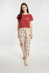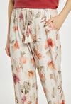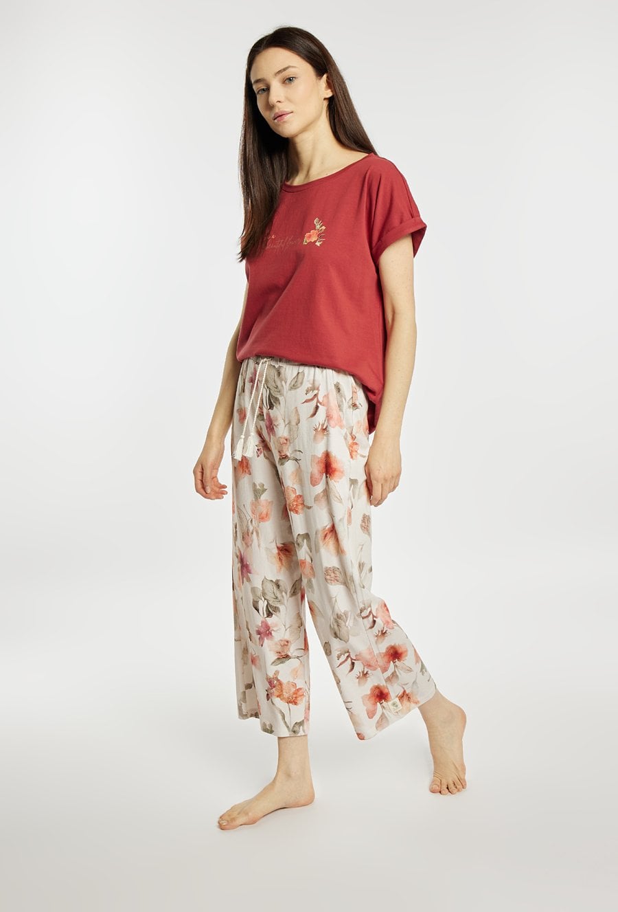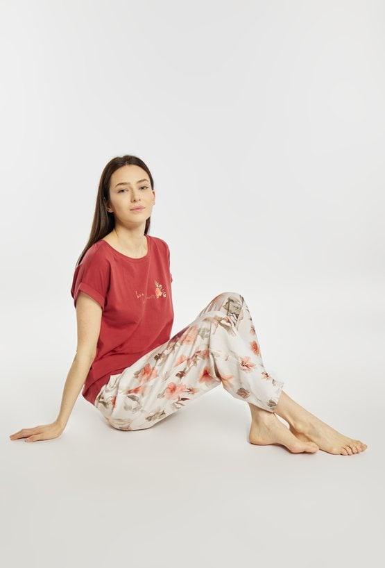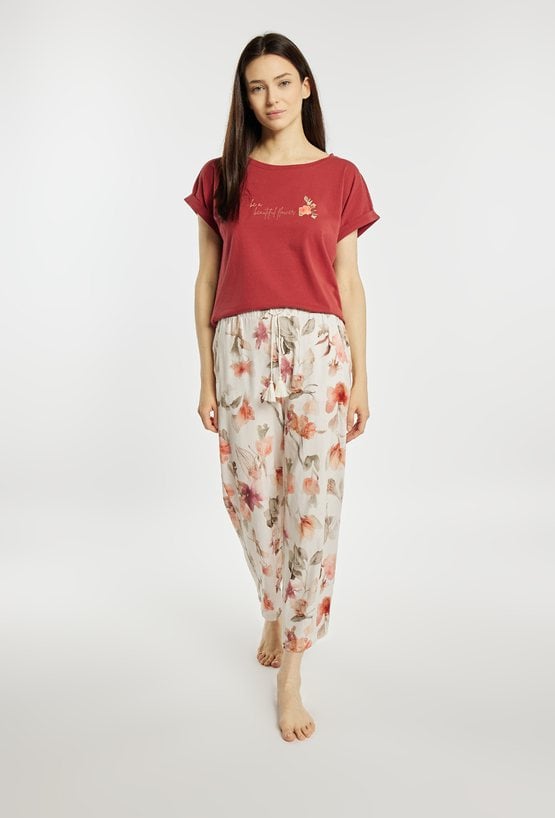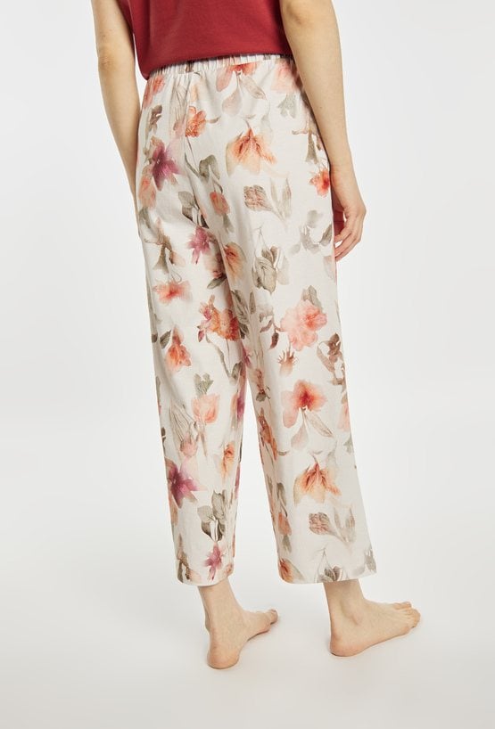 Spodnie damskie od piżamy o luźnym, komfortowym kroju z prostą nogawką. Model z elastycznym pasem oraz wiązaniem, które zapewnia wygodne dopasowanie. Całość zdobi delikatny, kwiatowy wzór, nadający im lekkości i kobiecego charakteru. Modelka na zdjęciu ma 177 cm wzrostu i prezentuje rozmiar S. Polecamy zestawić z koszulkami z tej samej kolekcji. Pasujące kody: