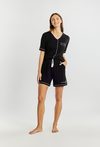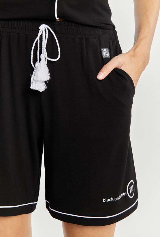 Dół od piżamy z kieszonkami po bokach. Spodenki z krótkimi prostymi nogawkami. Model ten polecamy dobrać z pasującą górą z tej samej linii o kodzie 24W-PYJ0150 .Modelka na zdjęciu ma 177 cm wzrostu i prezentuje rozmiar 36.