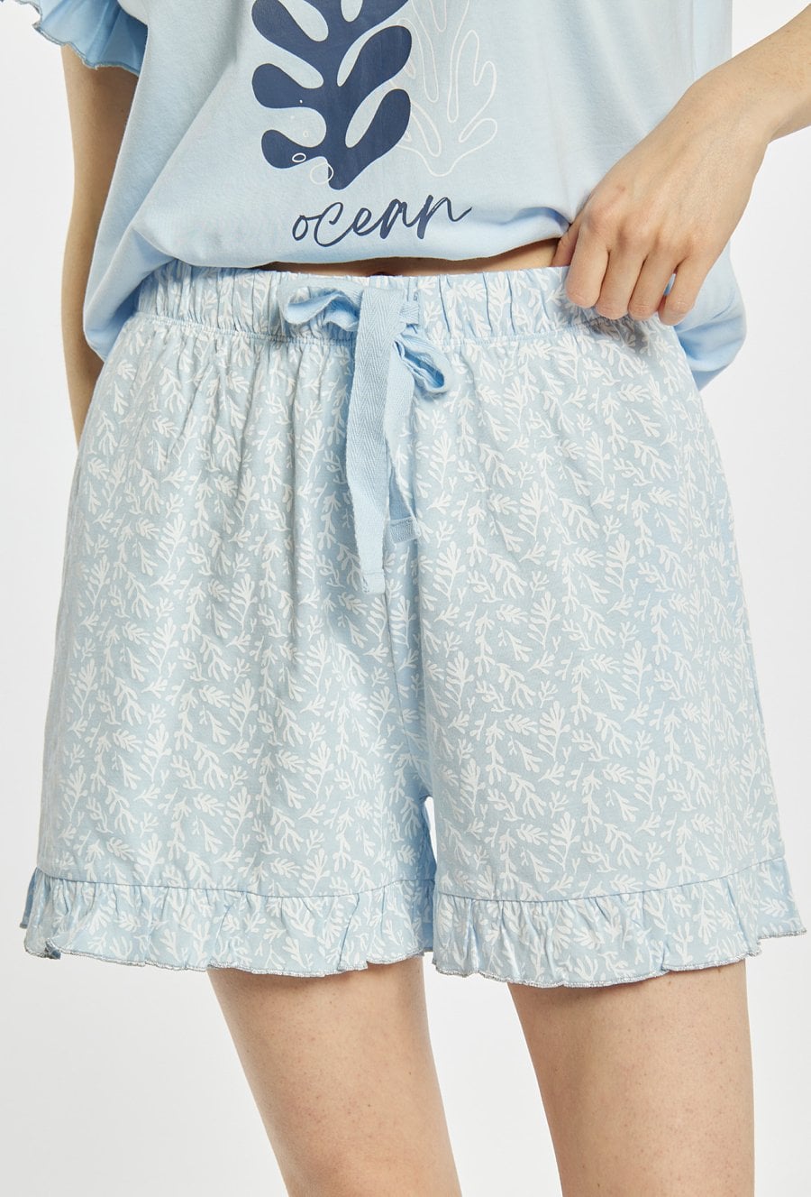 Szorty damskie od piżamy o luźnym, komfortowym kroju. Model z elastycznym pasem oraz wiązaniem, które zapewnia wygodne dopasowanie. Dół wykończony delikatną falbaną dodaje całości lekkości i dziewczęcego uroku. Modelka na zdjęciu ma 177 cm wzrostu i prezentuje rozmiar S. Polecamy zestawić z pasującymi koszulkami z tej samej kolekcji. Kody: