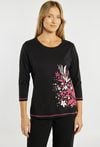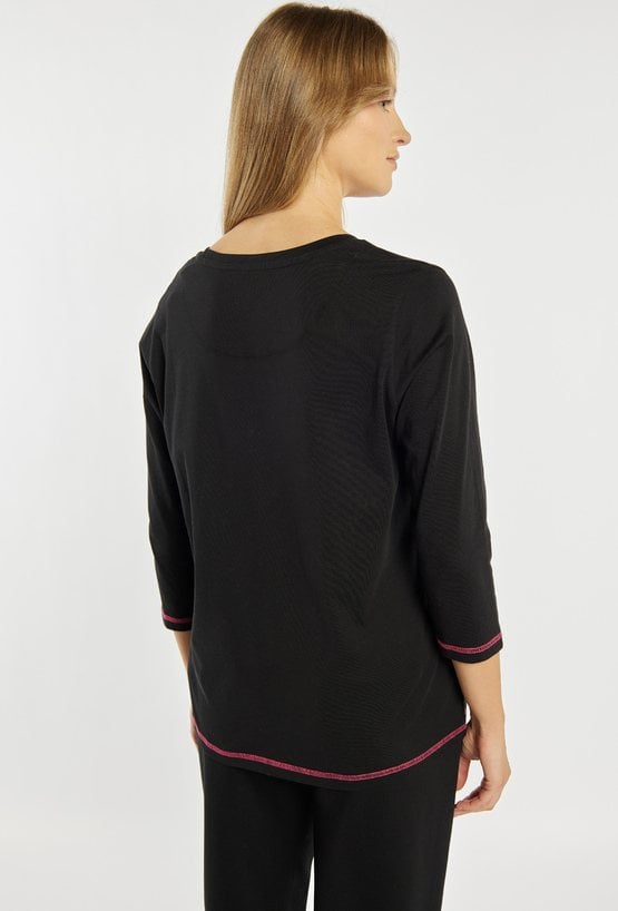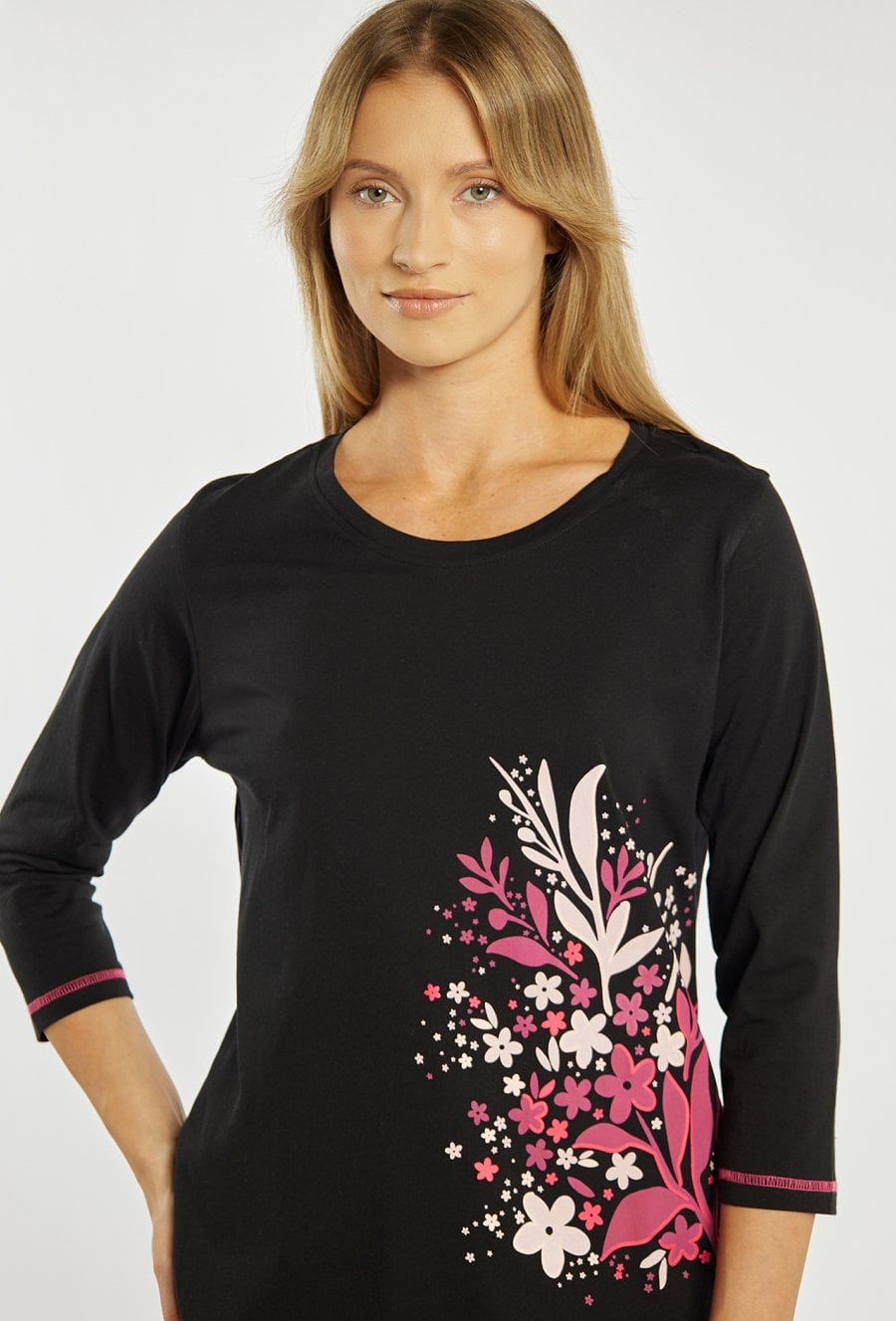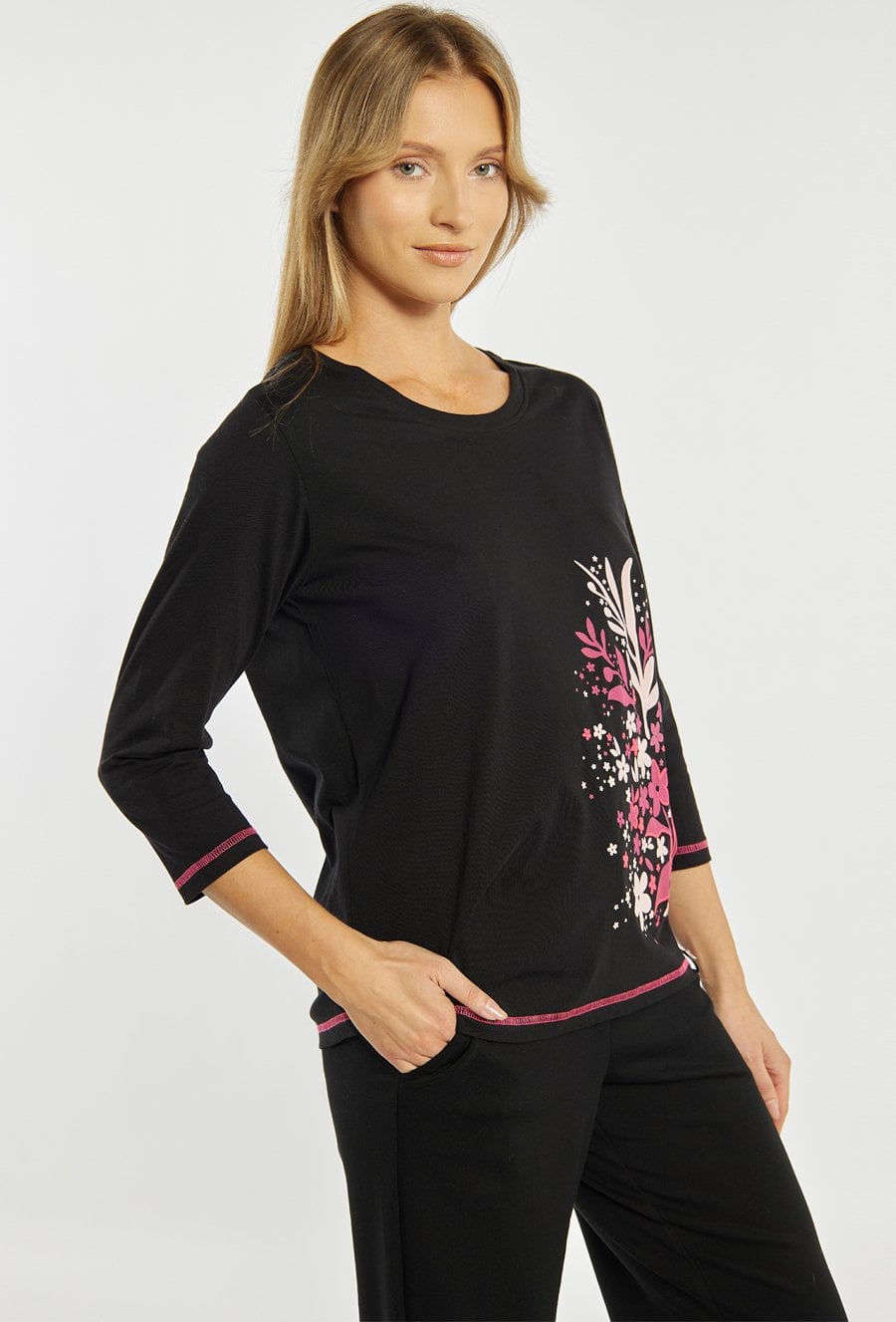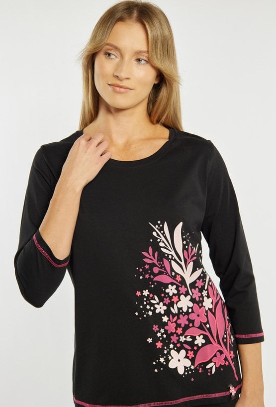 Bluzka od piżamy damskiej o wygodnym, klasycznym kroju. Model z rękawem o długości 3/4 oraz okrągłym dekoltem, który zapewnia komfort noszenia. Na przodzie znajduje się dekoracyjny, kwiatowy nadruk w kontrastowych kolorach. Modelka na zdjęciu ma 177 cm wzrostu i prezentuje rozmiar S.
