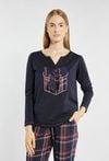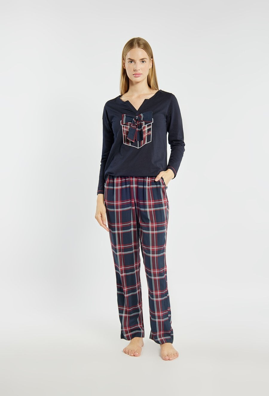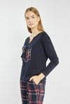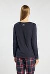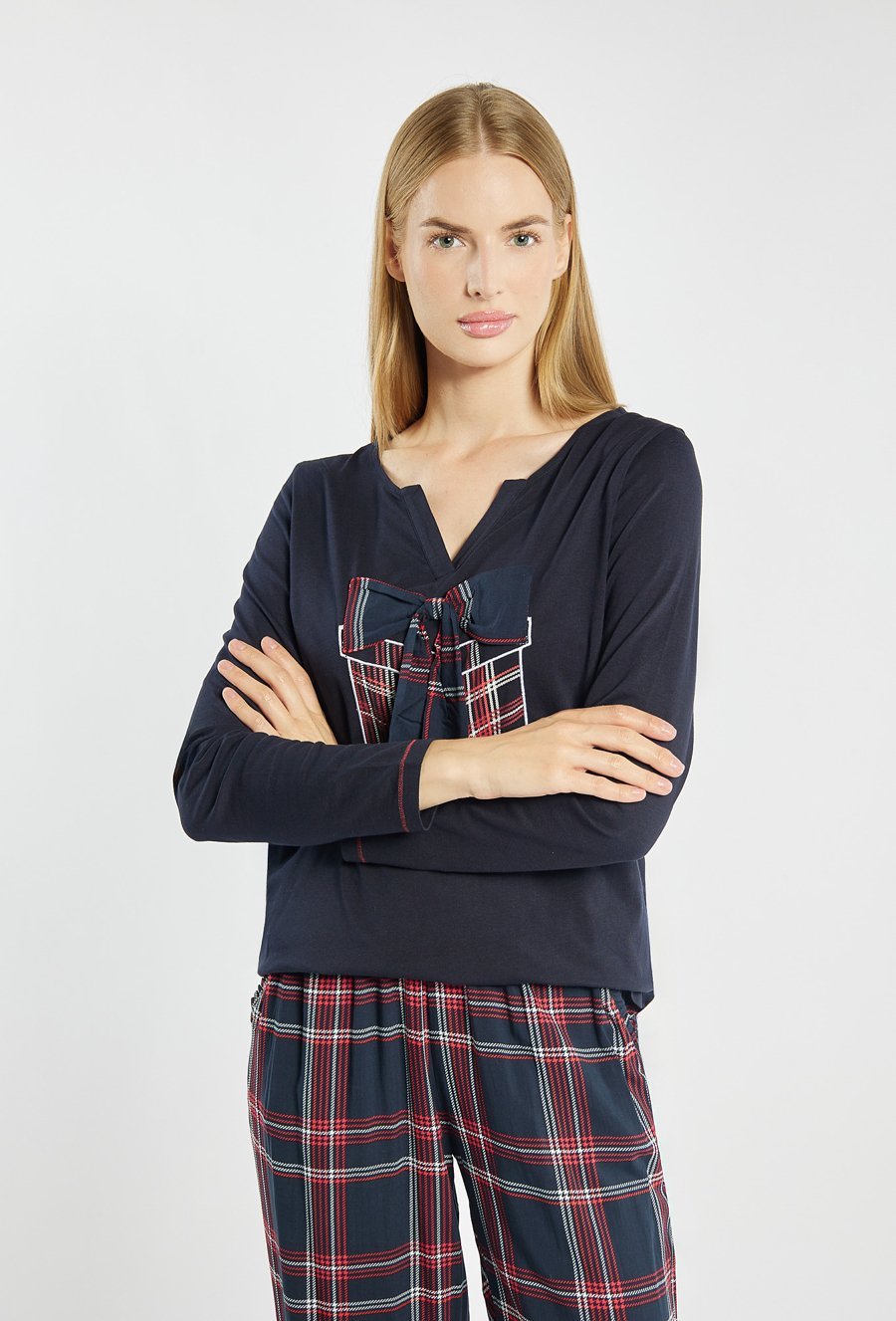 Koszulka od piżamy z długim rękawem, ozdobiona efektowną aplikacją w kształcie prezentu z kokardą. Dekolt w kształcie litery „V” dodaje jej subtelnego uroku, a kontrastowe przeszycia podkreślają świąteczny, radosny charakter. Idealna propozycja na zimowe wieczory i przytulne chwile w domu. Modelka na zdjęciu ma 177 cm wzrostu i prezentuje rozmiar S.