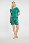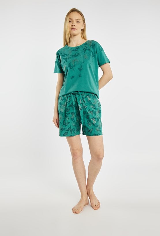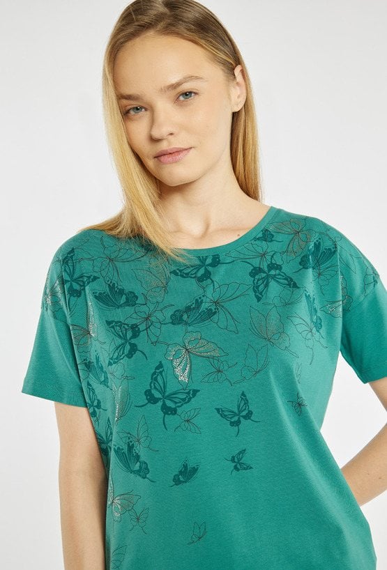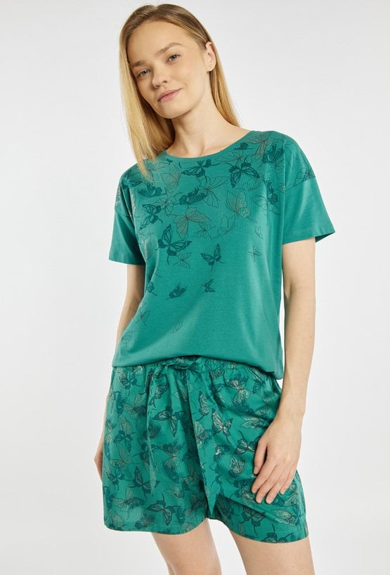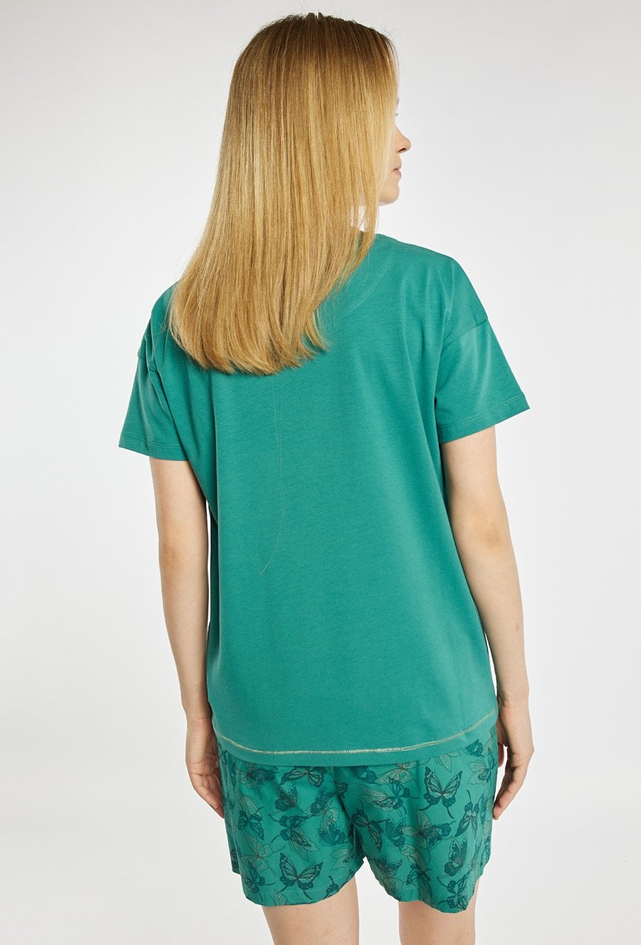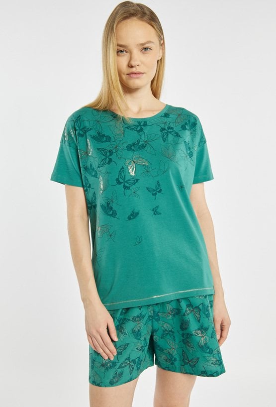 Koszulka od piżamy o prostym, luźnym kroju, z krótkim rękawem i okrągłym dekoltem. Przód zdobi delikatny nadruk z motywem motyli z subtelnymi, połyskującymi akcentami, całość tworzy spójny komplet z pasującymi spodniami piżamowymi. Modelka na zdjęciu ma 177 cm wzrostu i prezentuje rozmiar S. Kody do kompletu:
