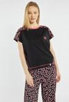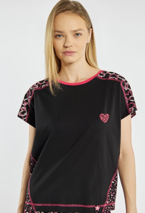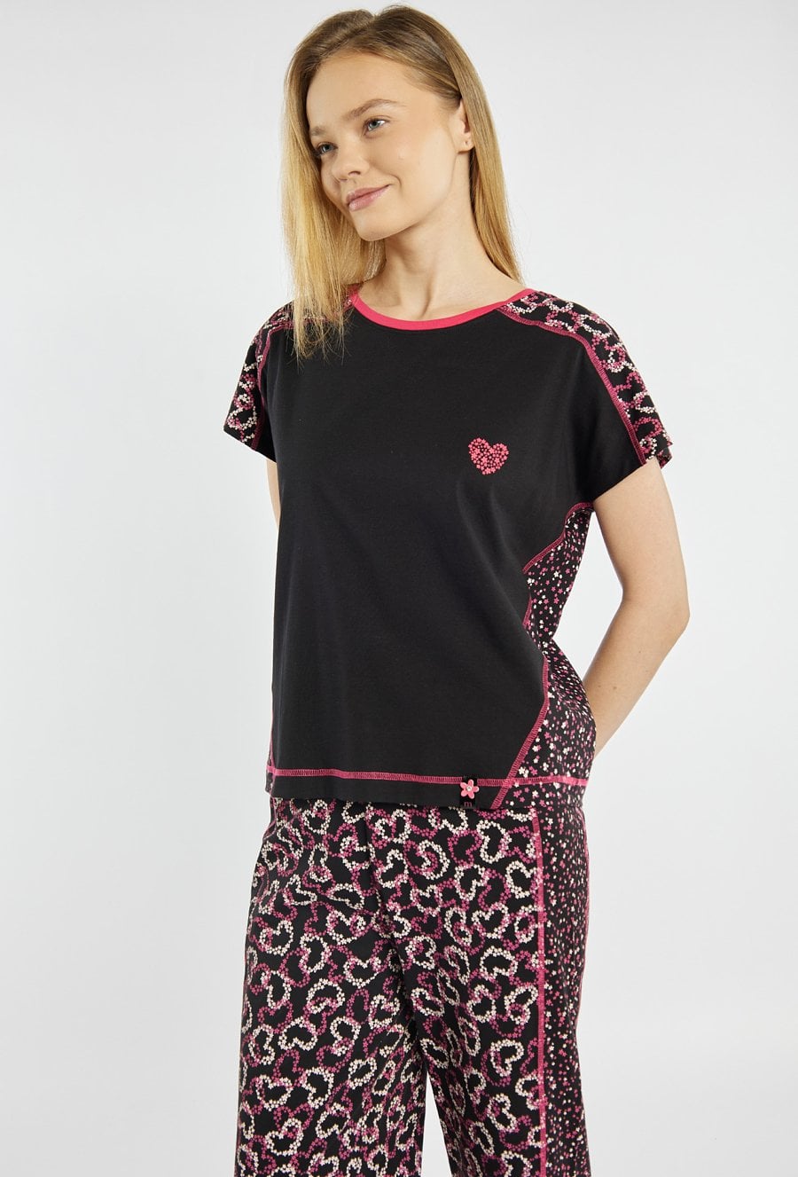 Koszulka od piżamy z krótkim rękawem. Koszulka z kontrastowymi wstawkami w serduszka na ramionach, bokach oraz na tyle, z okrągłym dekoltem wykończonym lamówką i drobnym motywem serca na przodzie. Modelka na zdjęciu ma 177 cm wzrostu i prezentuje rozmiar S.Kody do kompletu: