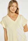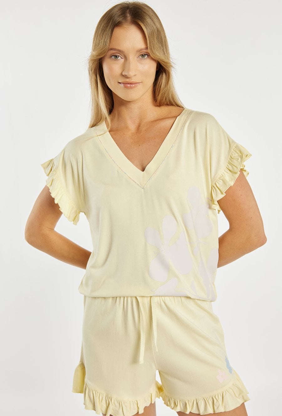 Koszulka od piżamy damskiej o lekkim, kobiecym kroju. Model z krótkim rękawem wykończonym delikatną falbanką oraz dekoltem w kształcie litery V, który subtelnie podkreśla linię szyi. Przód zdobi subtelny, kwiatowy motyw, nadający całości delikatnego i romantycznego charakteru. Modelka na zdjęciu ma 177 cm wzrostu i prezentuje rozmiar S. Można zestawić z pasującymi spodniami/spodenkami.
