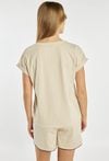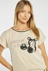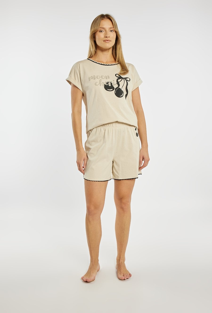 Koszulka od piżamy damskiej o wygodnym, swobodnym kroju. Model z krótkim rękawem oraz klasycznym, zaokrąglonym dekoltem wykończonym kontrastową lamówką. Przód zdobi dekoracyjny nadruk z motywem wiśni oraz napisem. Modelka na zdjęciu ma 177 cm wzrostu i prezentuje rozmiar S. Można zestawiać z pasującymi spodniami/spodenkami z tej samej kolekcji.