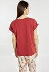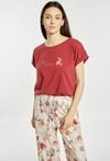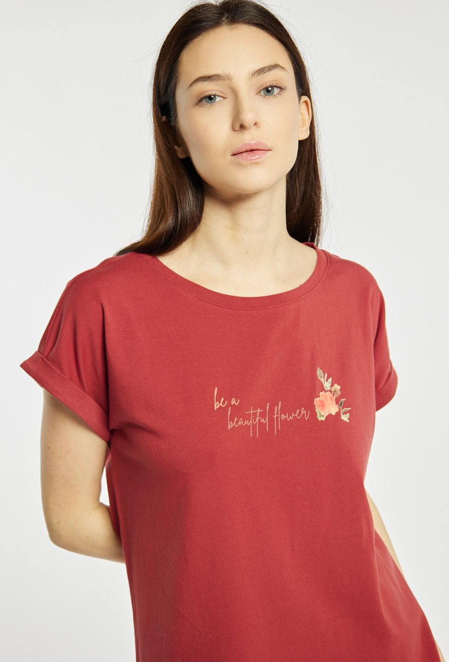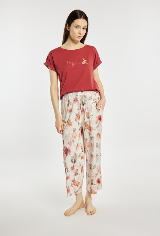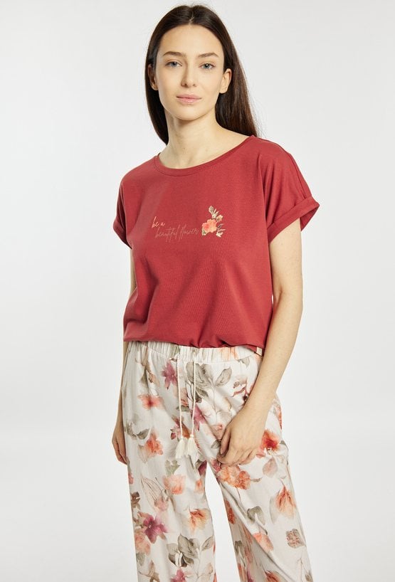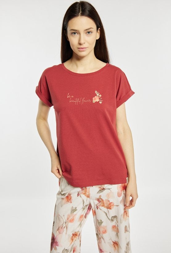 Koszulka damska od piżamy o luźnym, komfortowym kroju z krótkim rękawem. Model z klasycznym, okrągłym dekoltem oraz podwiniętymi rękawami, które nadają całości swobodnego charakteru. Z przodu znajduje się subtelny nadruk z napisem i motywem kwiatowym. Modelka na zdjęciu ma 177 cm wzrostu i prezentuje rozmiar S. Polecamy zestawić z dołami z tej samej kolekcji. Pasujące kody: