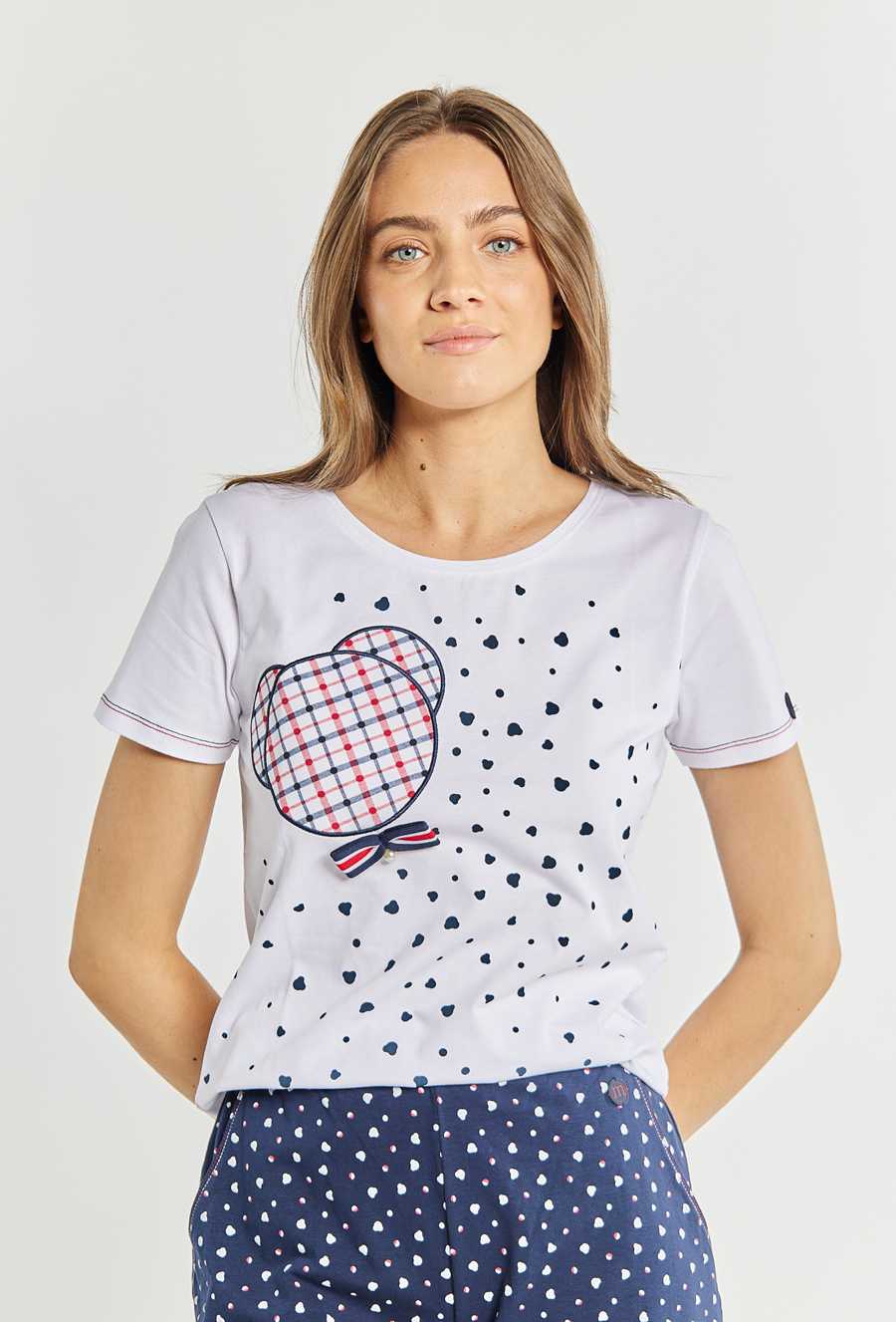 Koszulka od piżamy z krótkim rękawem. Koszulka z wzorem oraz małą kokardką z dodatkiem koralika z przodu. Polecamy również dobrać górę z tej samej linii. Modelka na zdjęciu ma 177 cm wzrostu i prezentuje rozmiar S.