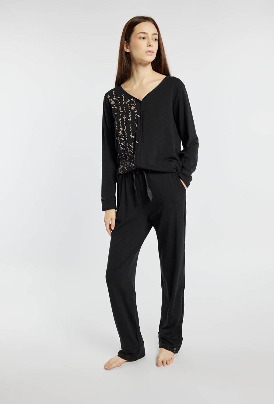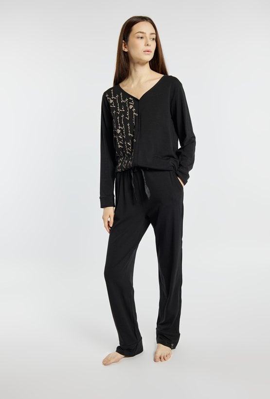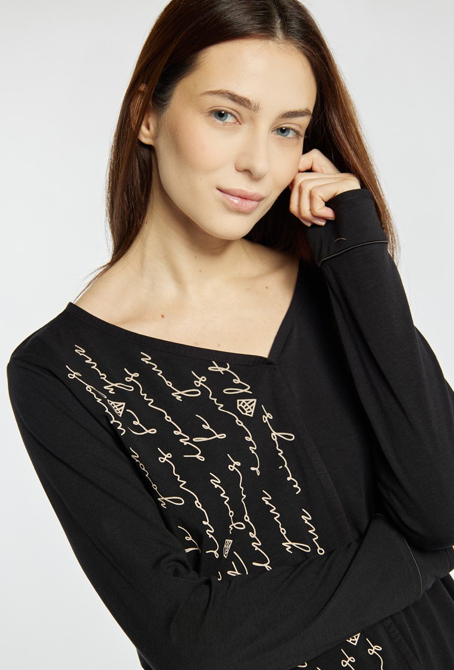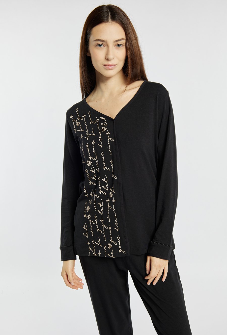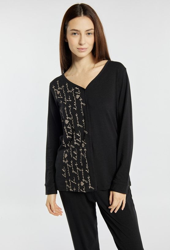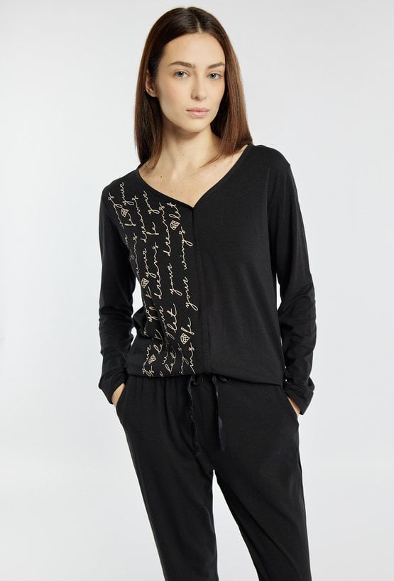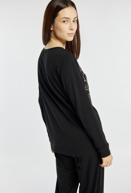 Koszulka od piżamy ma długi rękaw i dekolt w kształcie litery V. Koszulka wykonana jest z miękkiego, przyjemnego w dotyku materiału i ozdobiona jednobrzeżnym nadrukiem po jednej stronie, tworząc zestaw ze spodniami z tej samej kolekcji. Modelka na zdjęciu ma 177 cm wzrostu i prezentuje rozmiar S.