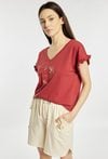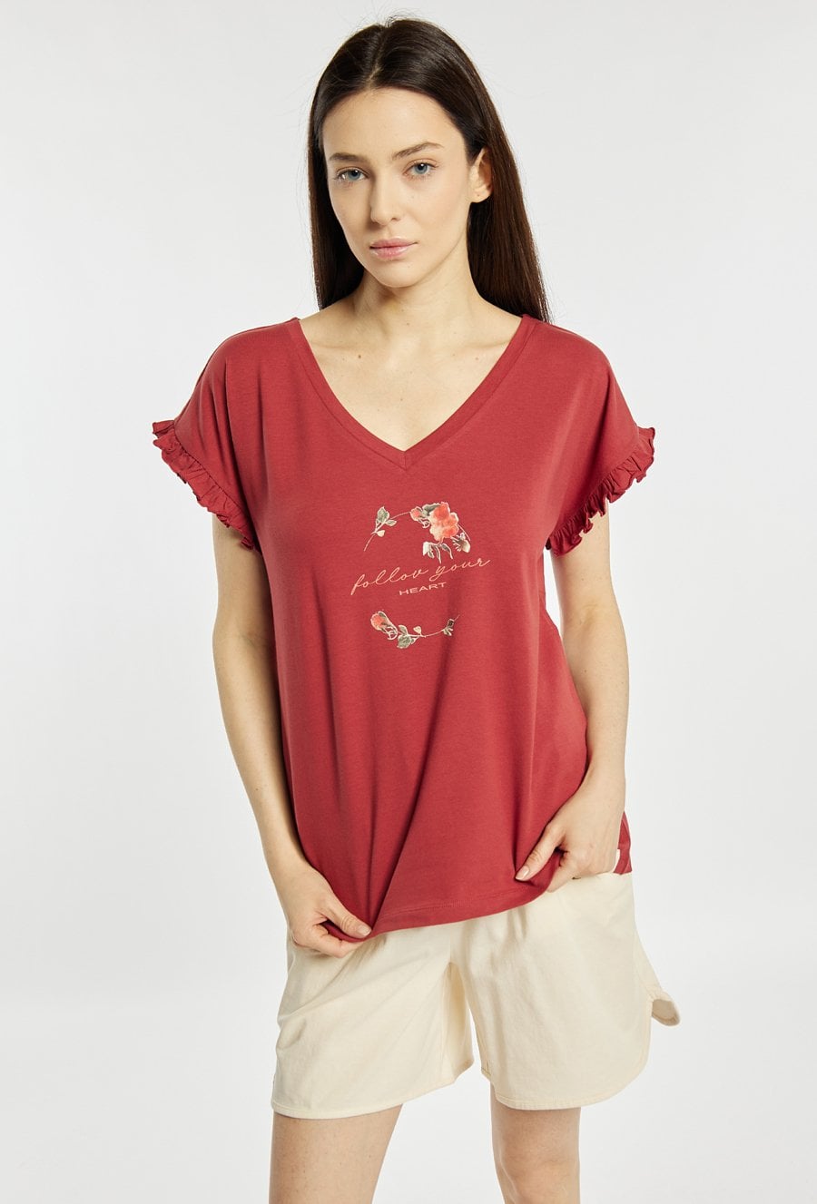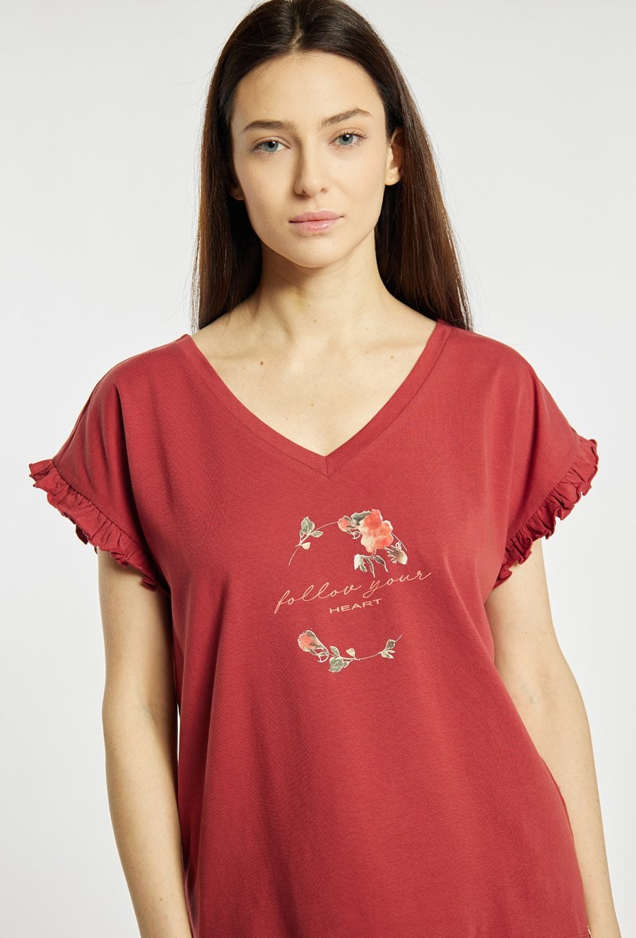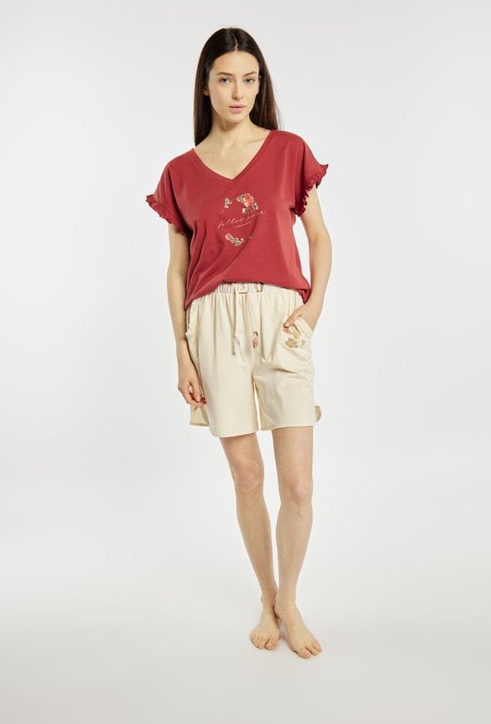 Koszulka damska od piżamy o luźnym, komfortowym kroju z krótkim rękawem. Model z dekoltem w kształcie litery V oraz ozdobnymi, falbaniastymi rękawami. Z przodu znajduje się delikatny nadruk z motywem kwiatowym i napisem. Modelka na zdjęciu ma 177 cm wzrostu i prezentuje rozmiar S. Polecamy zestawić z dołami z tej samej kolekcji. Pasujące kody: