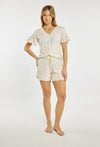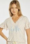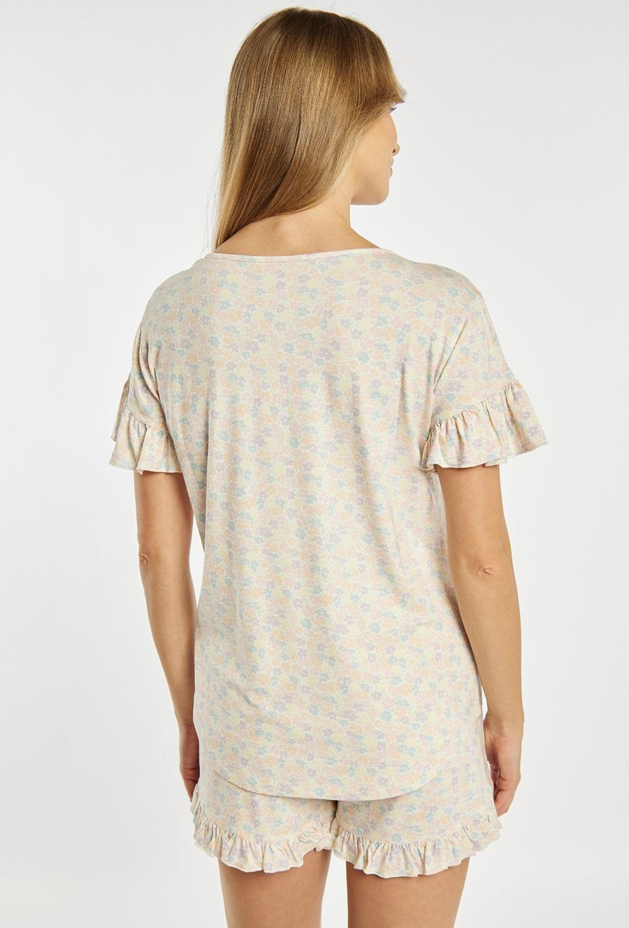 Koszulka od piżamy damskiej o lekkim, kobiecym kroju. Model z krótkim rękawem zakończonym delikatną falbanką oraz dekoltem w kształcie litery V. Całość zdobi subtelny, drobny wzór oraz napis „hello” na przodzie, który nadaje koszulce uroczego i dziewczęcego charakteru. Modelka na zdjęciu ma 177 cm wzrostu i prezentuje rozmiar S. Można zestawić z pasującymi spodniami/spodenkami.