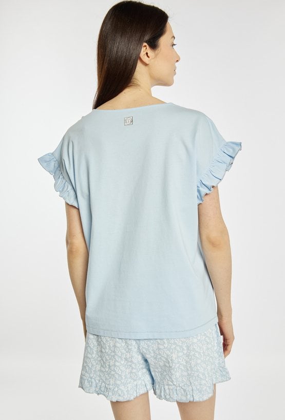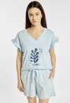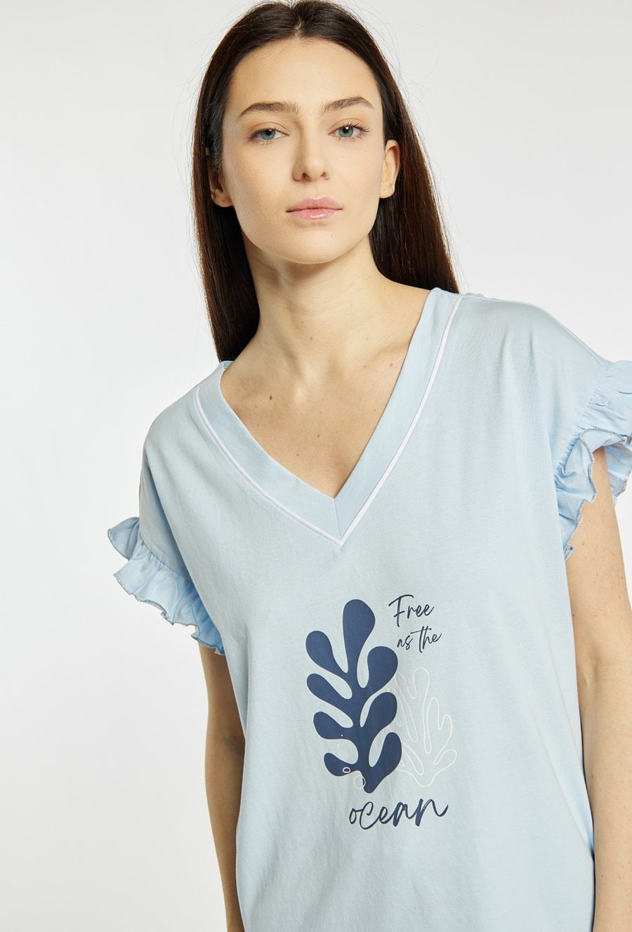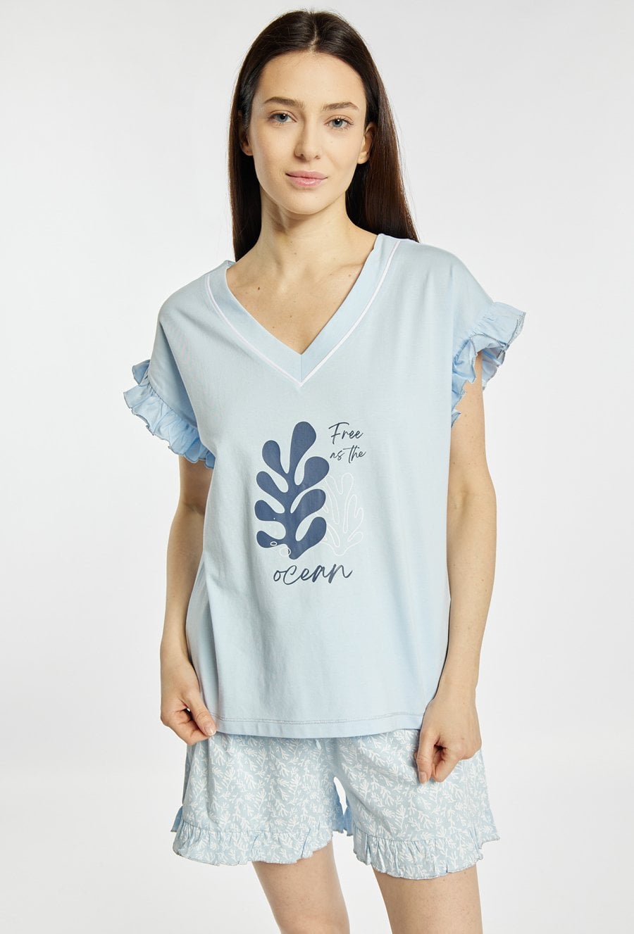 Koszulka damska od piżamy o luźnym, komfortowym kroju z krótkim rękawem. Model z dekoltem w kształcie litery V, wykończonym kontrastową lamówką, który subtelnie podkreśla linię szyi. Ozdobne, falbaniaste rękawy nadają całości lekkiego charakteru. Modelka na zdjęciu ma 177 cm wzrostu i prezentuje rozmiar S. Polecamy zestawić z pasującymi kodami z tej samej kolekcji.