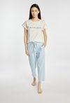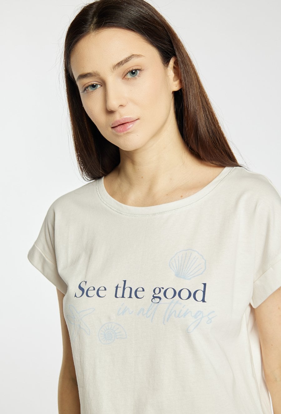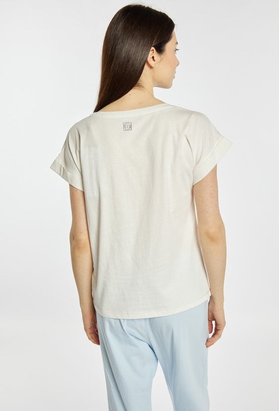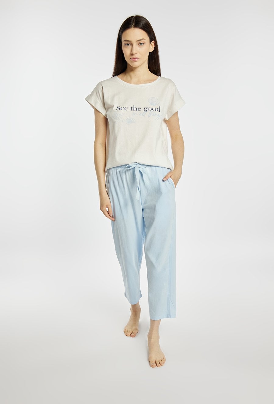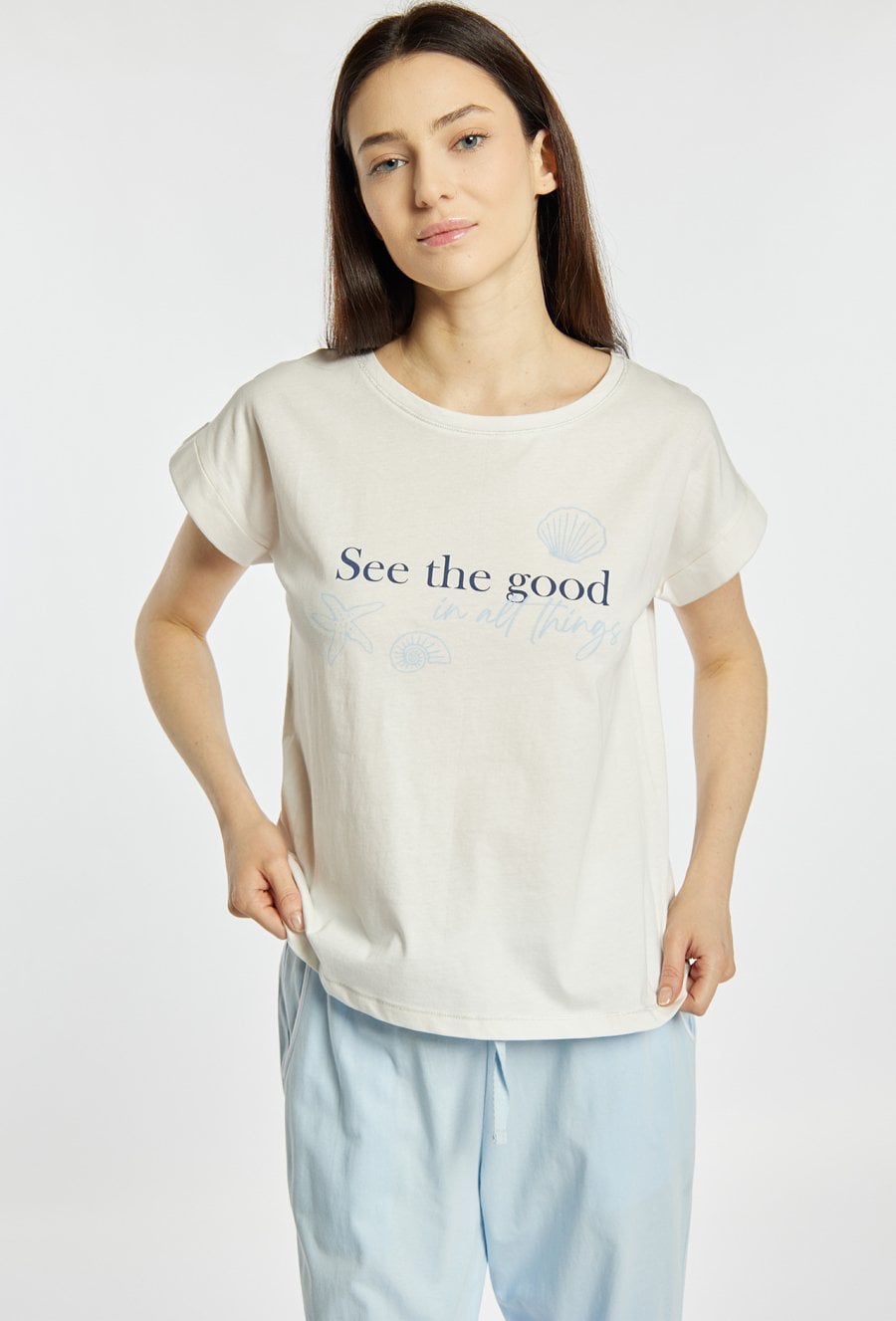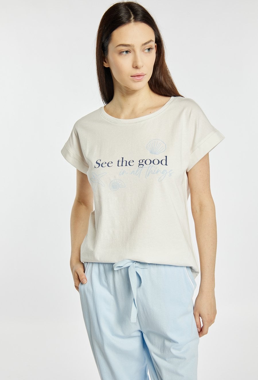 Koszulka damska od piżamy o luźnym, komfortowym kroju z krótkim rękawem. Model z klasycznym, okrągłym dekoltem oraz podwiniętymi rękawami, które nadają całości swobodnego charakteru. Z przodu znajduje się subtelny nadruk z napisem i motywami morskimi, dodający lekkiego, wakacyjnego klimatu. Modelka na zdjęciu ma 177 cm wzrostu i prezentuje rozmiar S. Polecamy zestawić z pasującymi kodami z tej samej kolekcji.