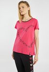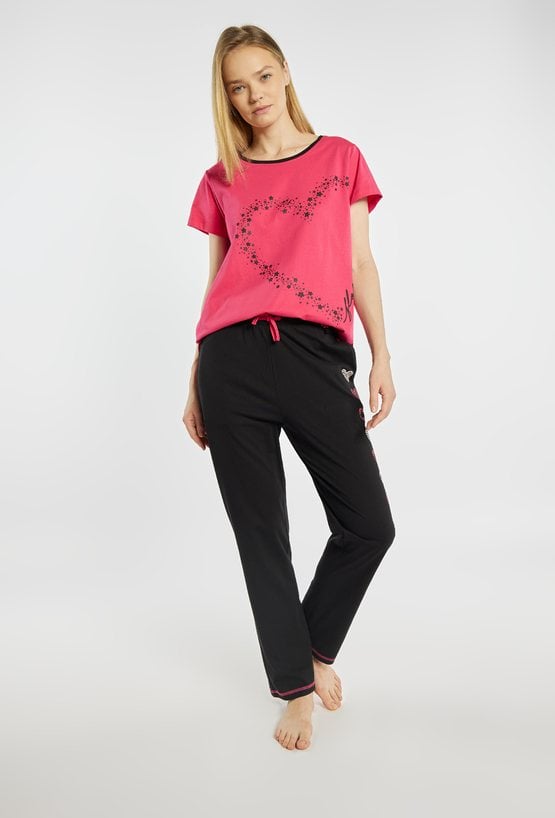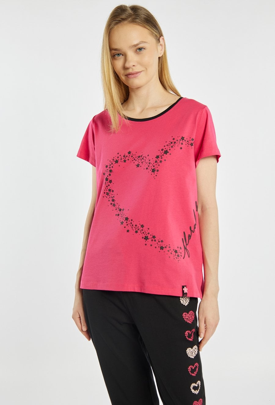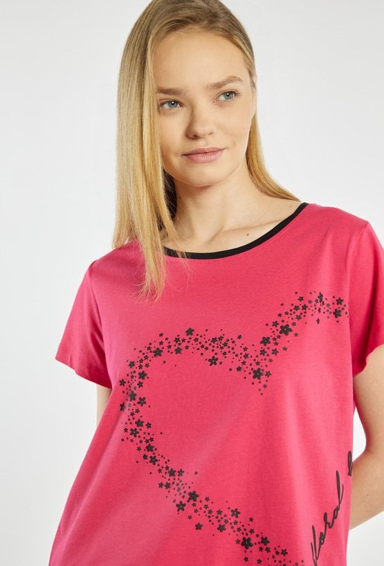 Koszulka od piżamy o prostym, wygodnym kroju, z krótkim rękawem i klasycznym, okrągłym dekoltem. Przód zdobi delikatny nadruk w kształcie serca z drobnych gwiazdek oraz dekoracyjny napis. Koszulka dobrze sprawdzi się w komplecie ze spodniami lub spodenkami z tej samej kolekcji. Modelka na zdjęciu ma 177 cm wzrostu i prezentuje rozmiar S. Kody do kompletu: