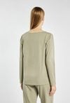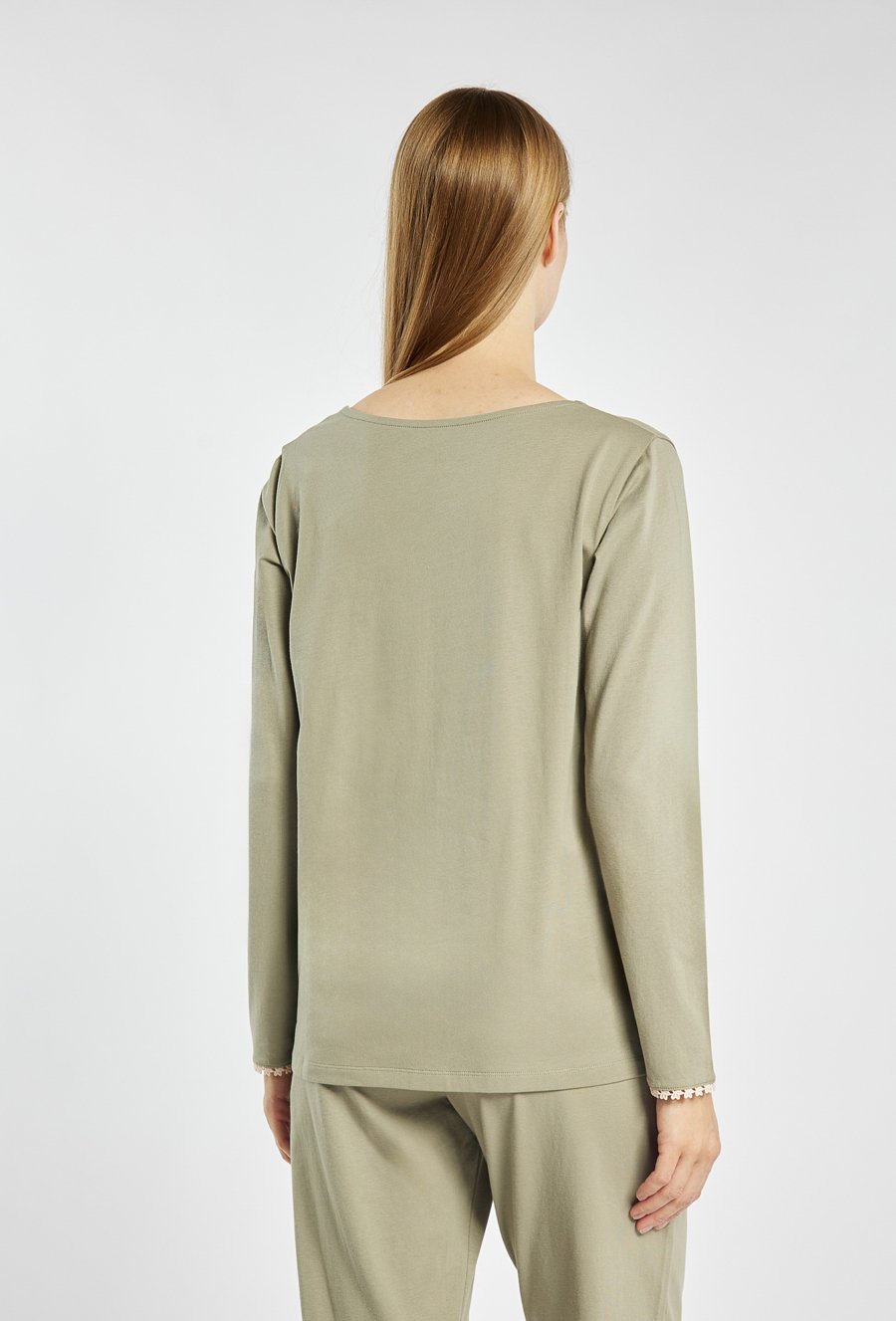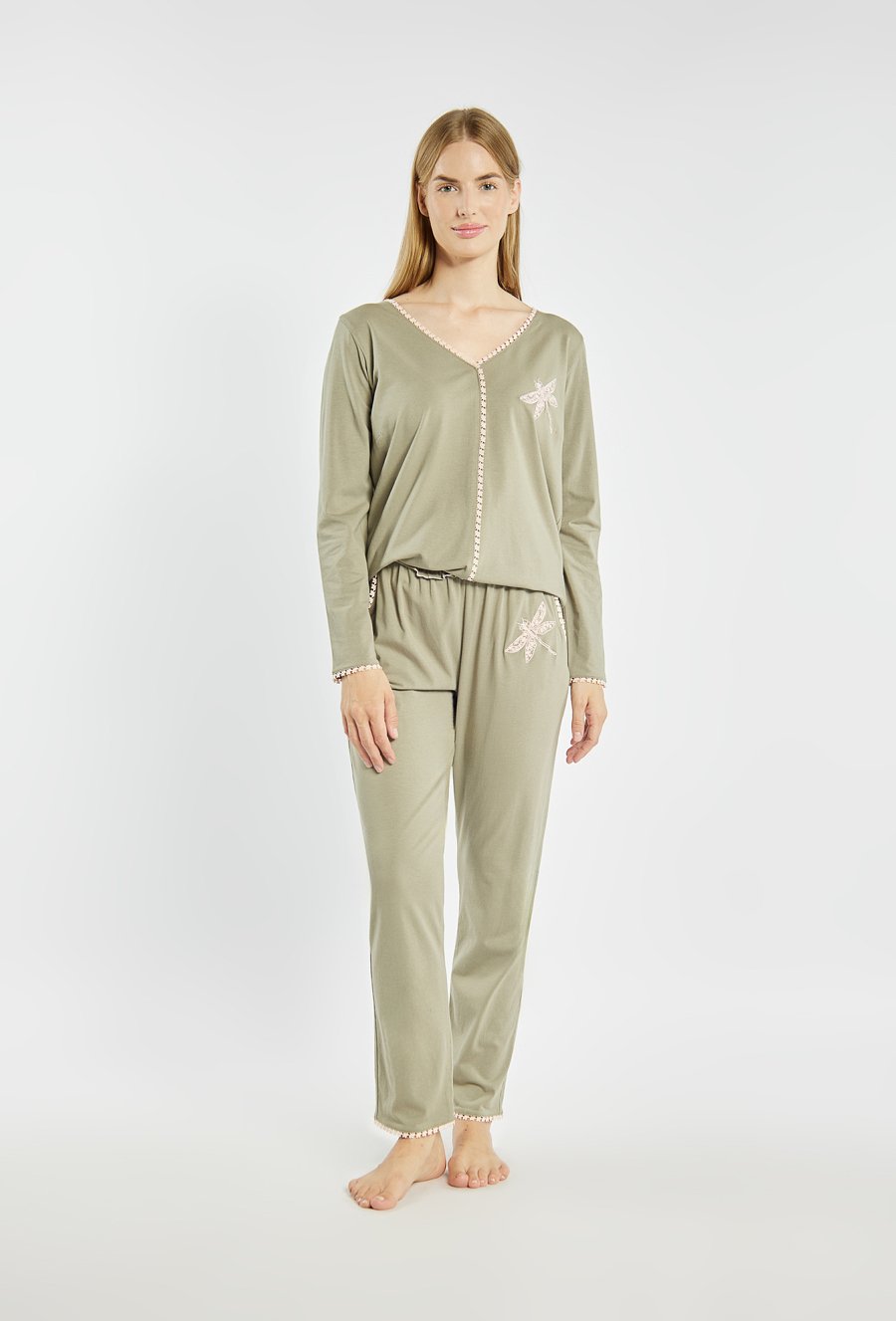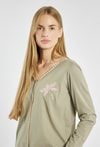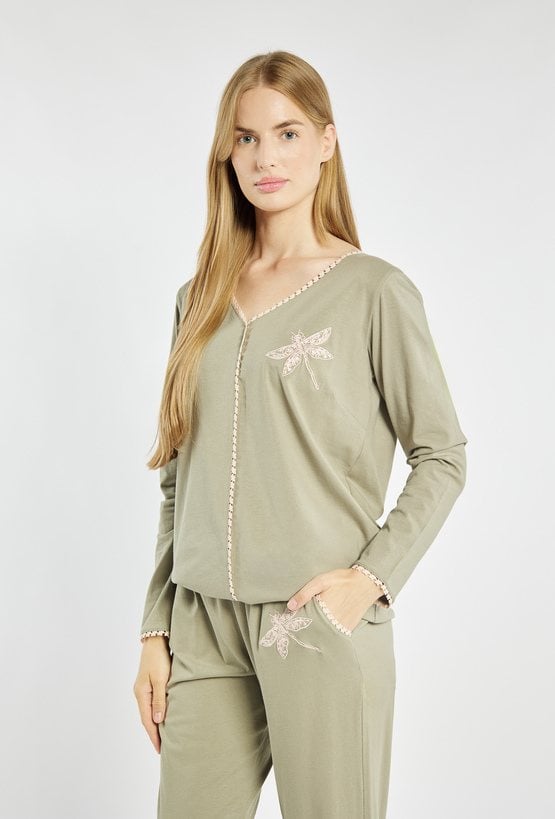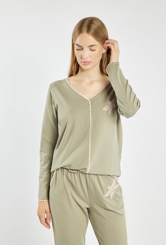 Damska koszulka od piżamy w kolorze delikatnej zieleni, zdobiona haftem ważki na piersi. Model z długim rękawem, dekoltem w serek i subtelną, koronkową lamówką wzdłuż krawędzi dodaje całości kobiecego uroku. Doskonale komponuje się ze spodniami w tym samym stylu. Modelka na zdjęciu ma 177 cm wzrostu i prezentuje rozmiar S.