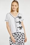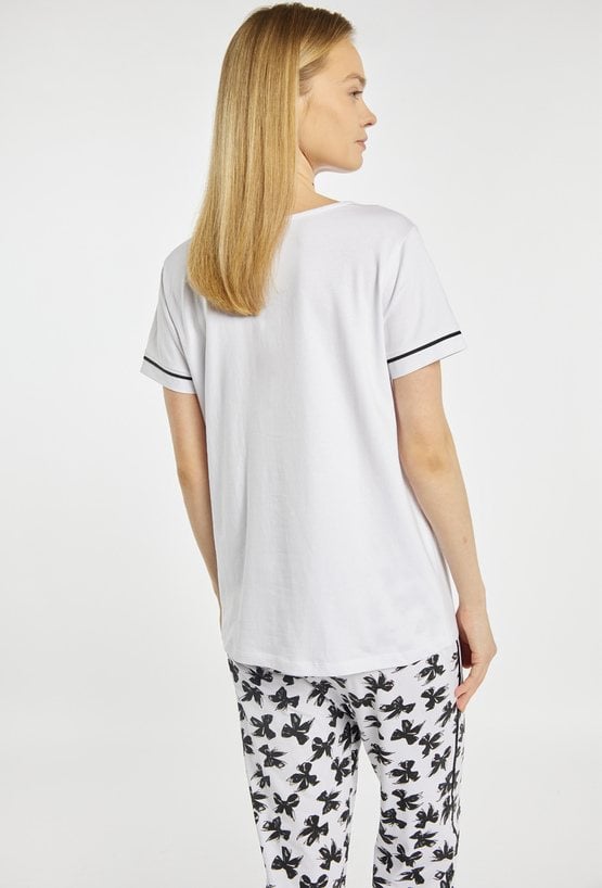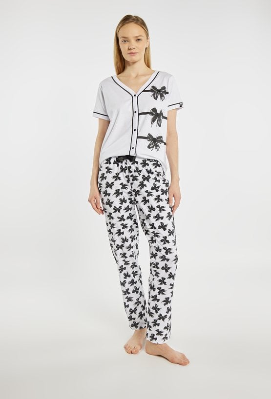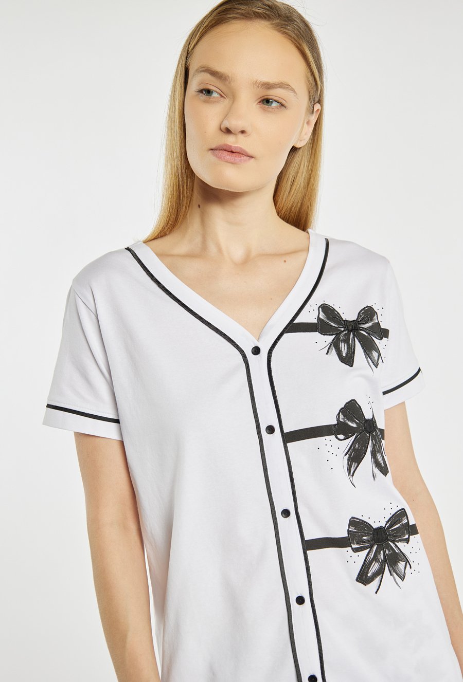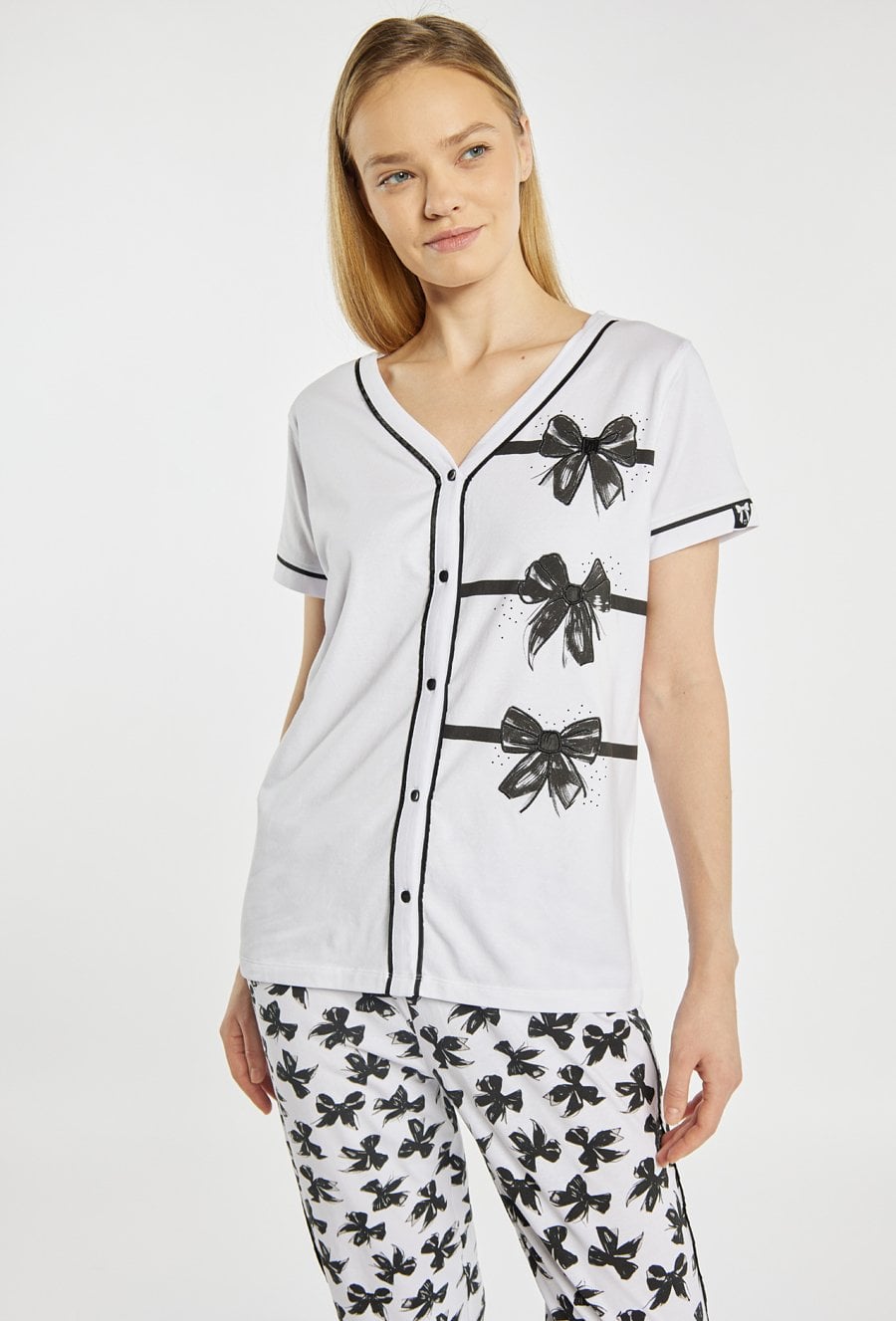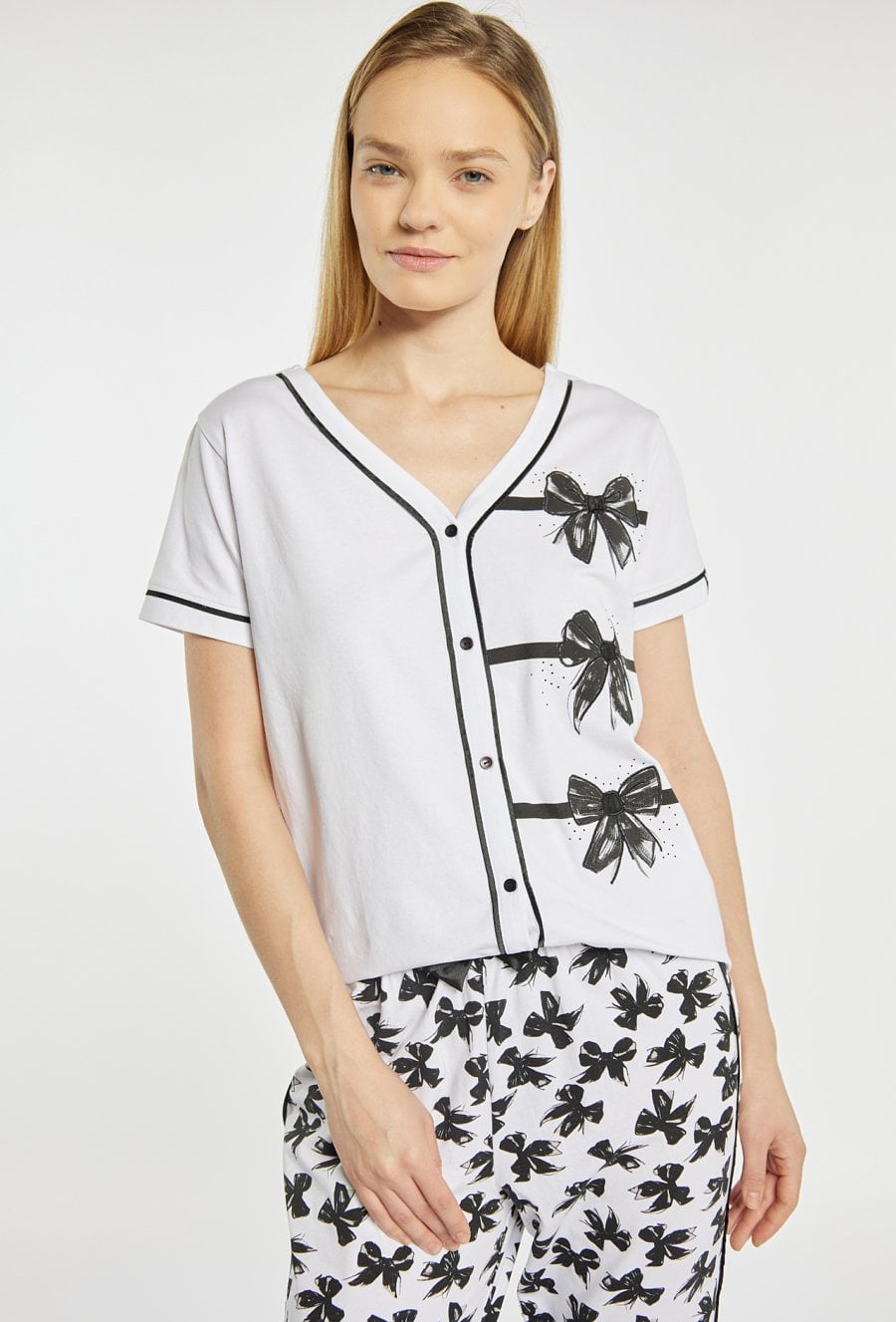 Rozpinana koszulka od piżamy o wygodnym, klasycznym fasonie, zapinana na guziki na całej długości. Model z dekoltem w kształcie litery V, wykończonym kontrastową lamówką, która podkreśla całość. Przód zdobi dekoracyjny nadruk z motywem kokardek, nadający koszulce kobiecego, subtelnego charakteru. Modelka na zdjęciu ma 177 cm wzrostu i prezentuje rozmiar S. Możemy zestawić z pasującym dołem z tej samej kolekcji:
