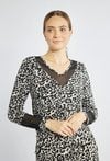 Piżamowa góra ozdobiona stylowym, zwierzęcym wzorem. Koszulka posiada długie rękawy i dekolt w serek, subtelnie wykończony delikatnym siateczkowym materiałem. . Polecamy zapoznać się z innymi produktami z naszej nowej kolekcji. Modelka na zdjęciu ma 177 cm wzrostu i prezentuje rozmiar S.