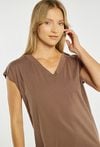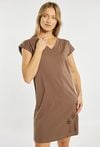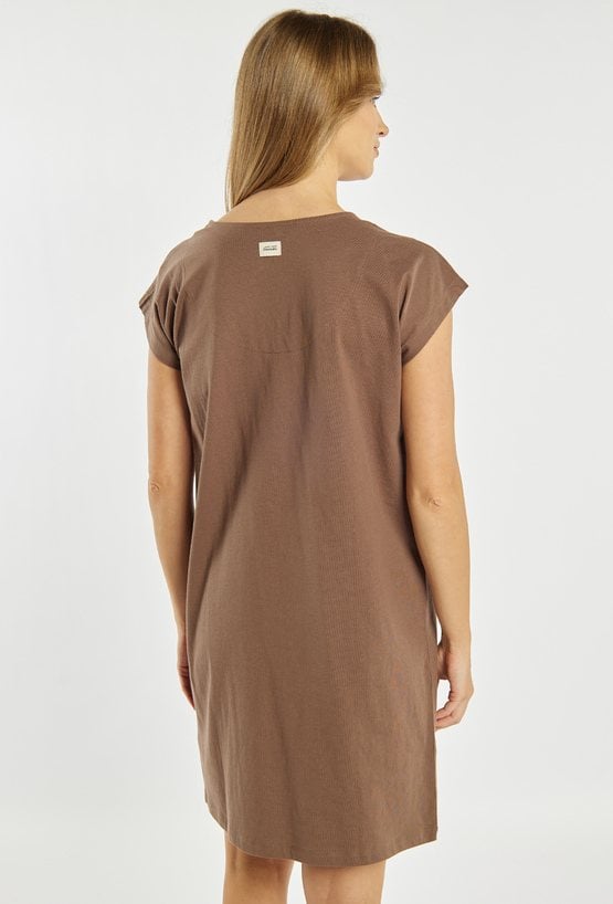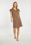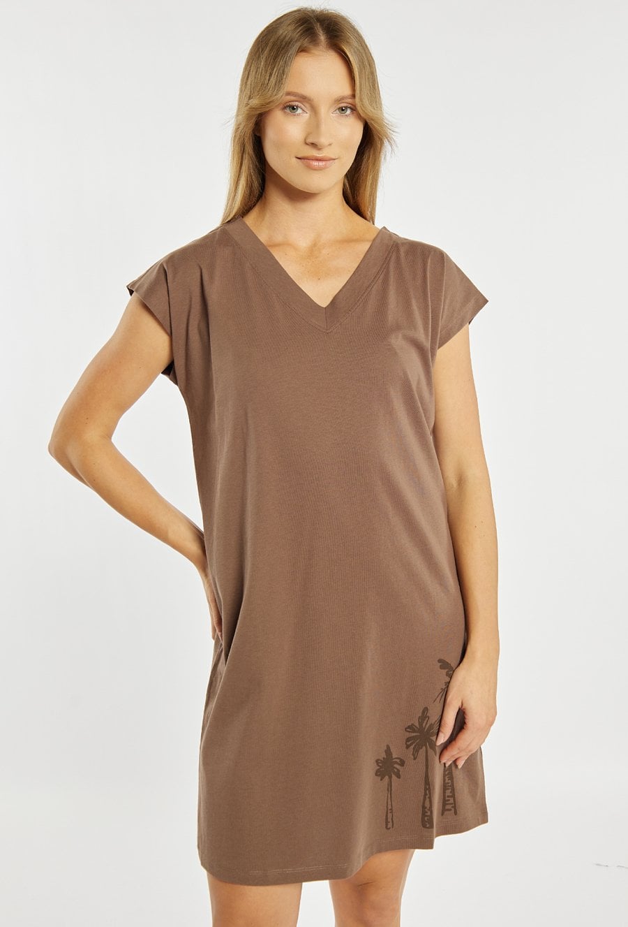 Koszula nocna damska o wygodnym, swobodnym kroju. Model z krótkim rękawem oraz dekoltem w kształcie litery V, który subtelnie podkreśla linię szyi. Na dole sukienki znajduje się delikatny nadruk z motywem palm. Modelka na zdjęciu ma 177 cm wzrostu i prezentuje rozmiar S.