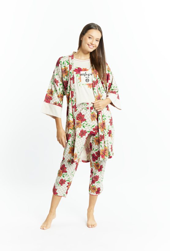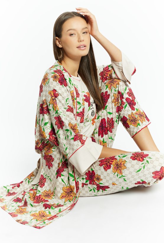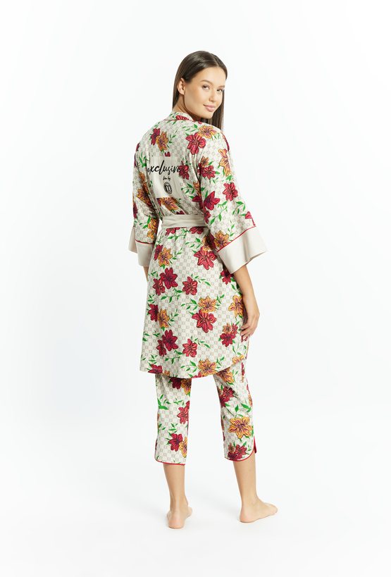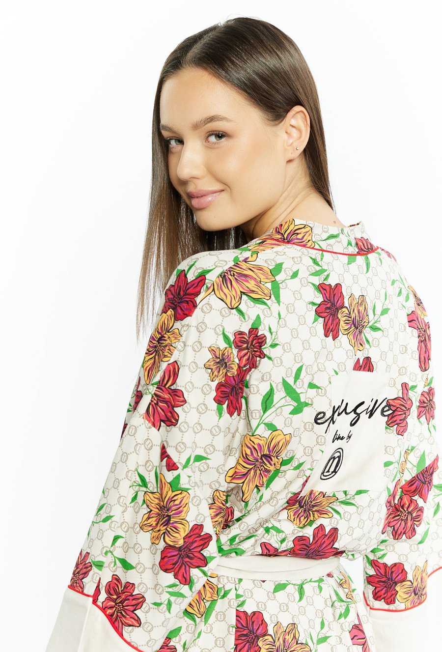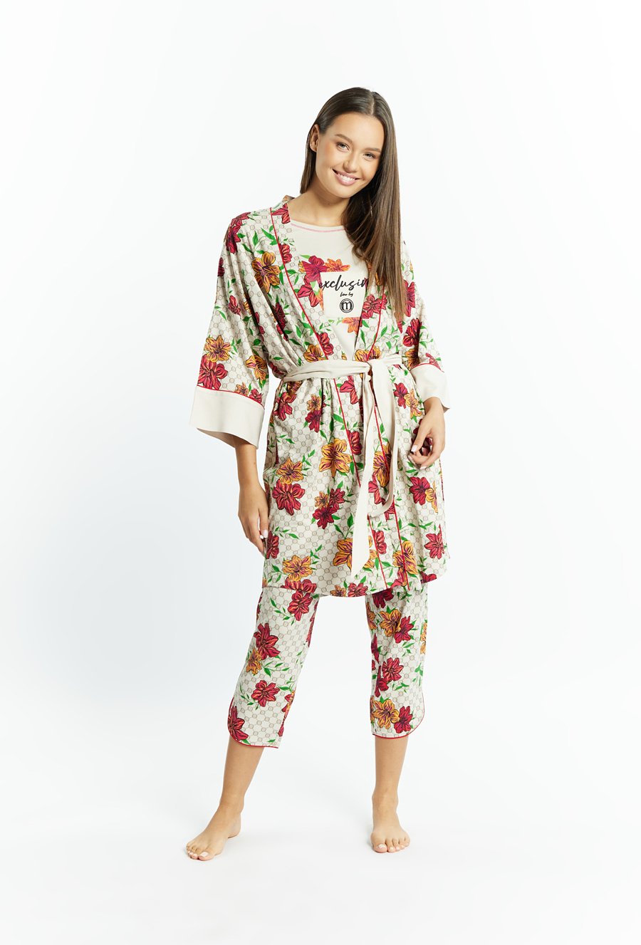Wzorzysty szlafrok damski z rękawami 3/4. Szlafrok wiązany w pasie. Polecamy dobrać pasującą piżamie z tej samej linii. Góra: PYJ0660-K015, dół do wyboru: PYJ0510-KM15 lub PYJ0520-KM15. Modelka na zdjęciu ma 177 cm wzrostu i prezentuje rozmiar 36