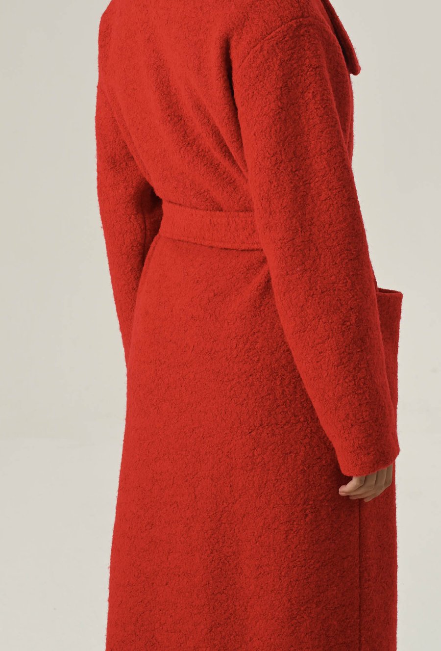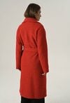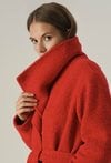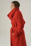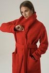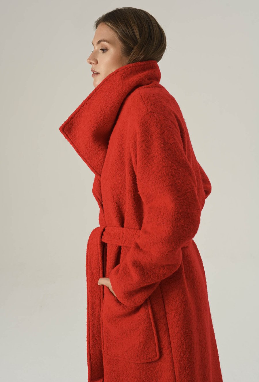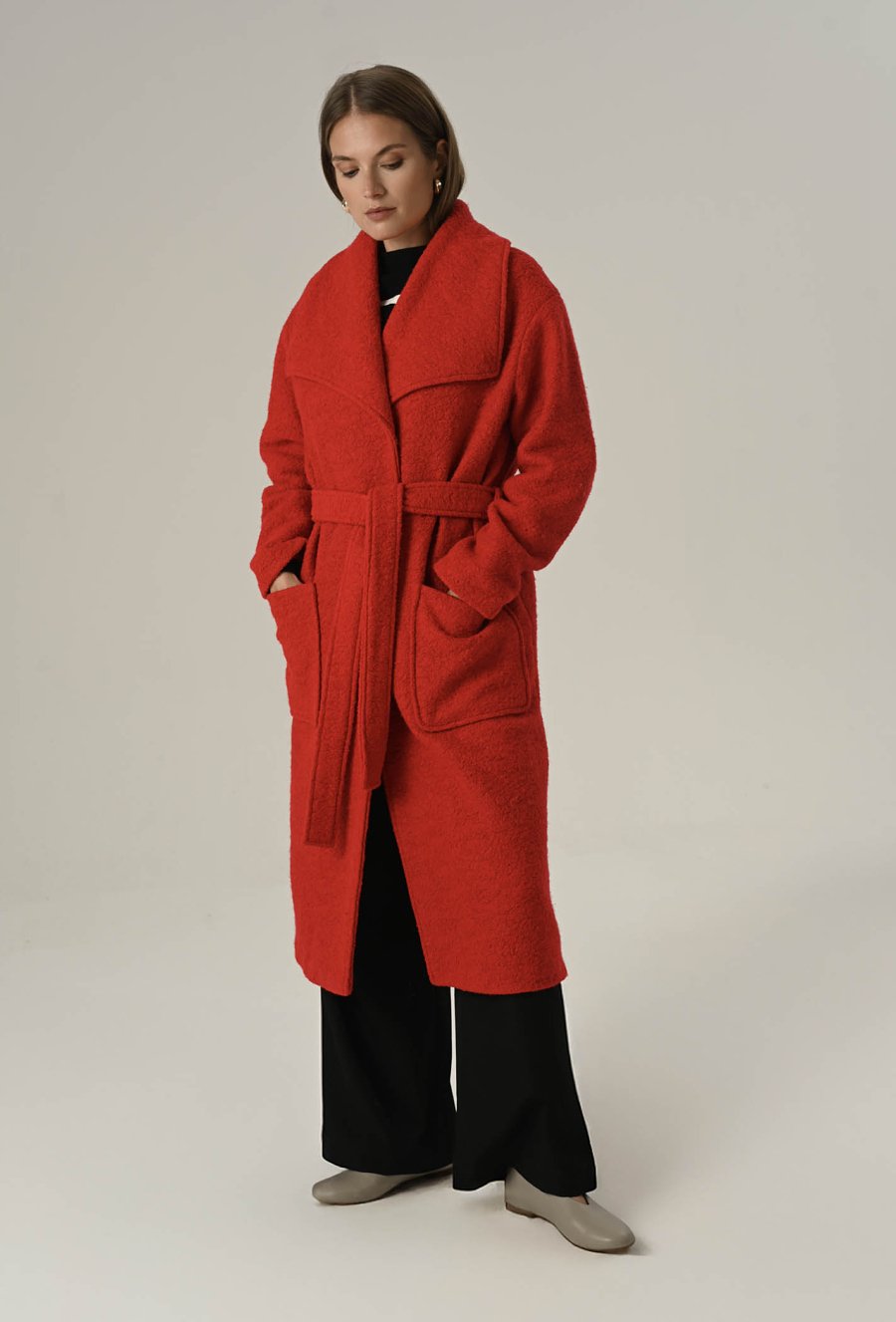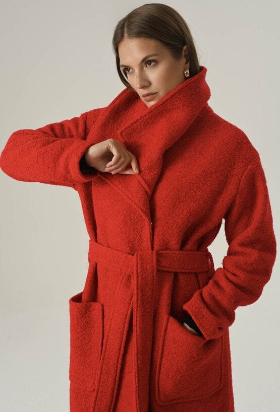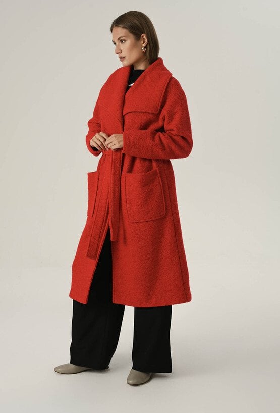 Styl i ciepło w nowoczesnym wydaniu! Długi płaszcz o fasonie kimona z 45% zawartością wełny to idealny wybór na chłodne dni. Model wyposażony w szerokie klapy, duże kieszenie i materiałowy pasek, który pięknie podkreśla talię. Zgaszony kolor czerwieni z modnym akcentem sprawdzi się w każdej stylizacji. Dostępny w dwóch wyrazistych kolorach – eleganckiej czerni i energetycznej czerwieni. Wybierz swój i noś z pewnością siebie! Modelka na zdjęciu ma 175 cm wzrostu i prezentuje