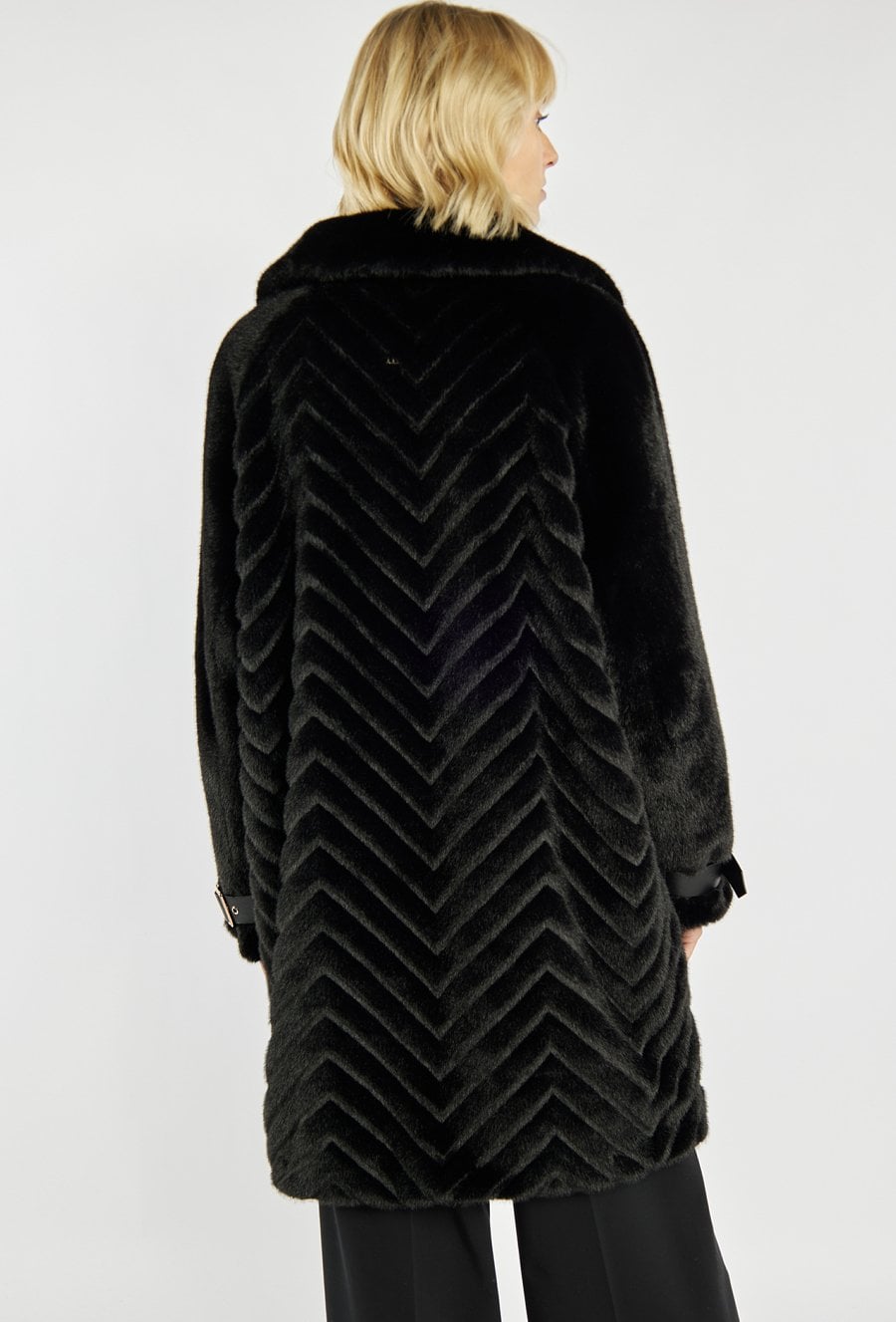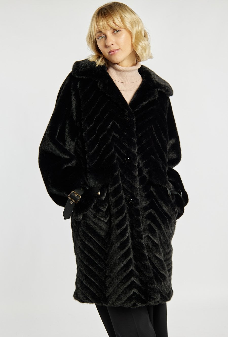 Elegancki płaszcz o długości do kolan. Płaszcz ma klasyczny kołnierz oraz zapinanie na guziki z przodu. Rękawy wykończone paskami z klamrami, które dodają całości wyrazistego akcentu. Płaszcz ma efektowne, ukośne przeszycia w dolnej części, które tworzą modny, geometryczny wzór. To stylowy model, idealny na chłodniejsze dni. Modelka na zdjęciu ma 177 cm wzrostu i prezentuje rozmiar 36.