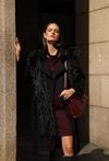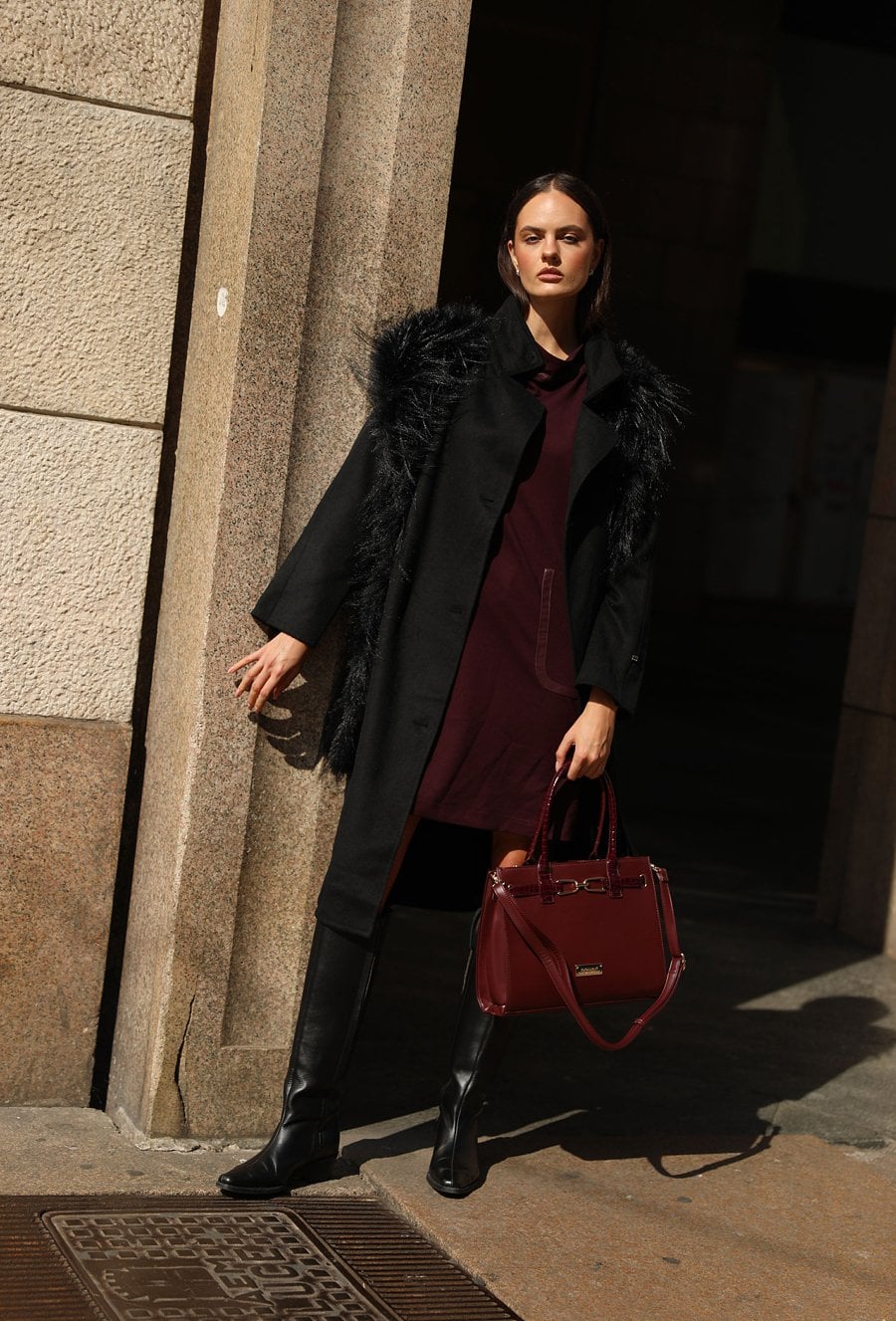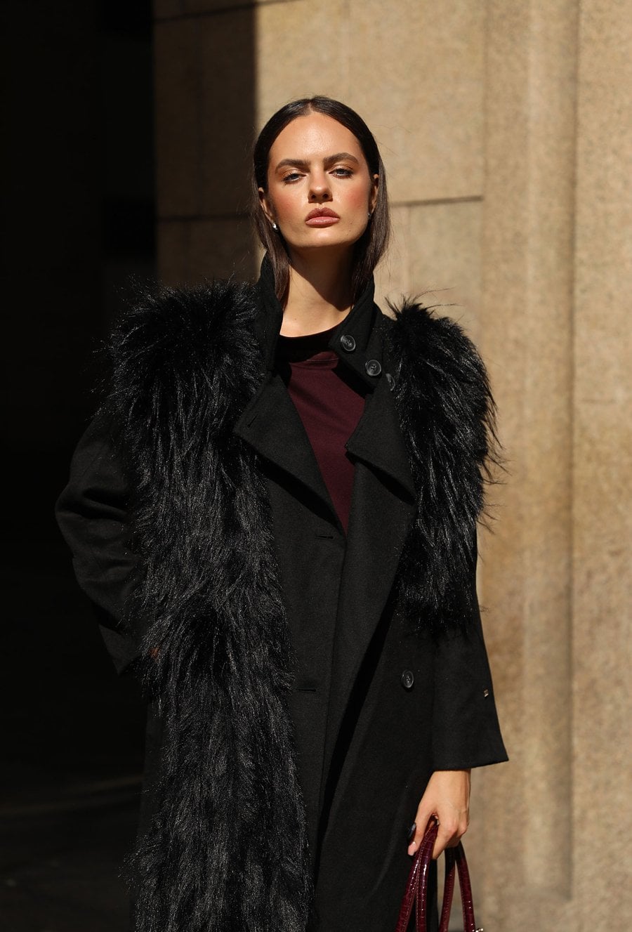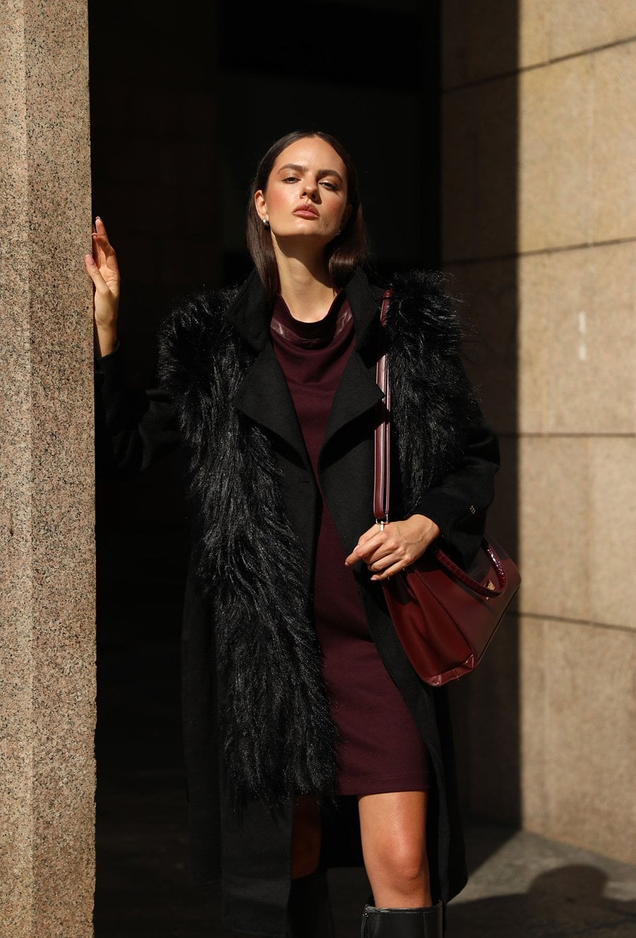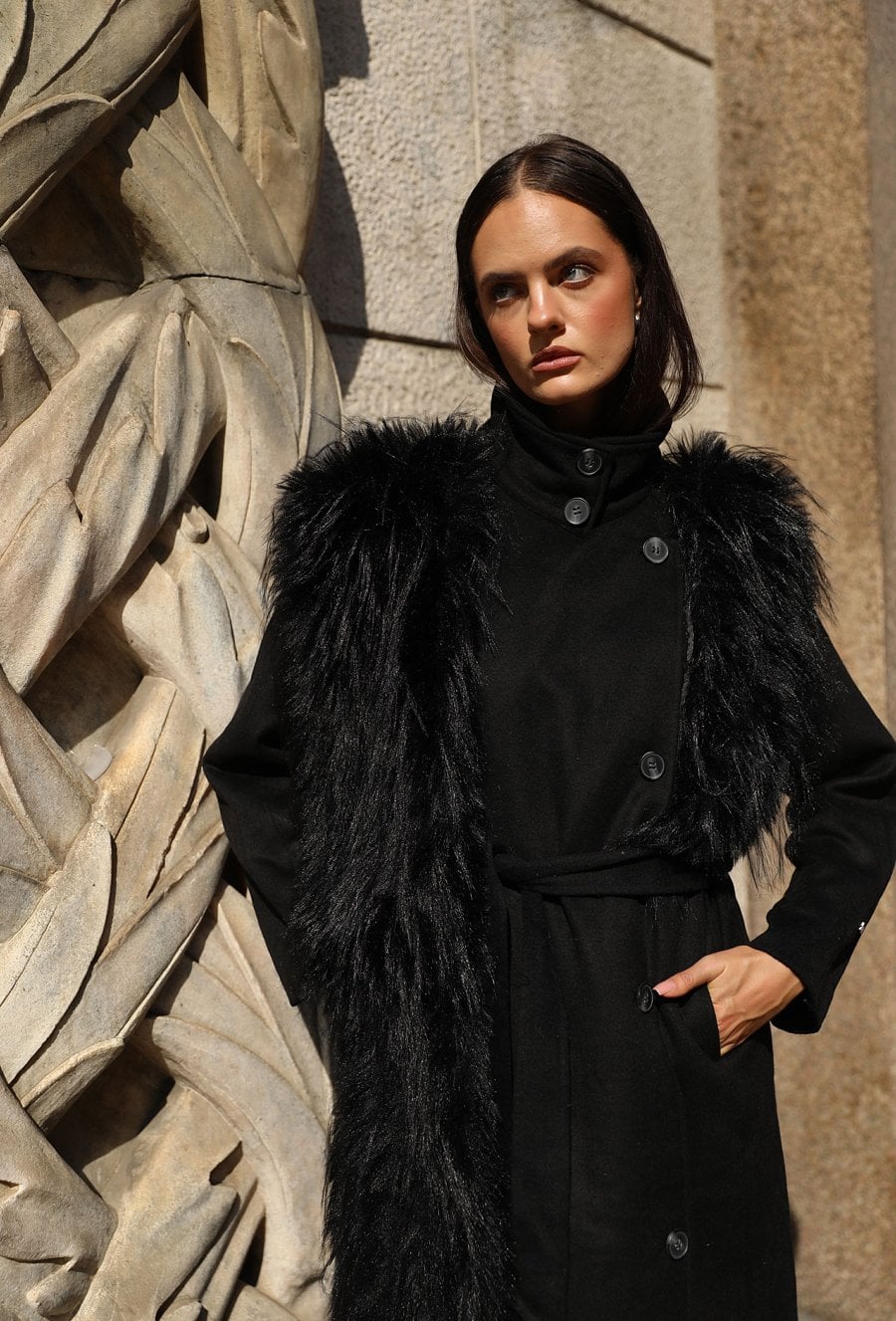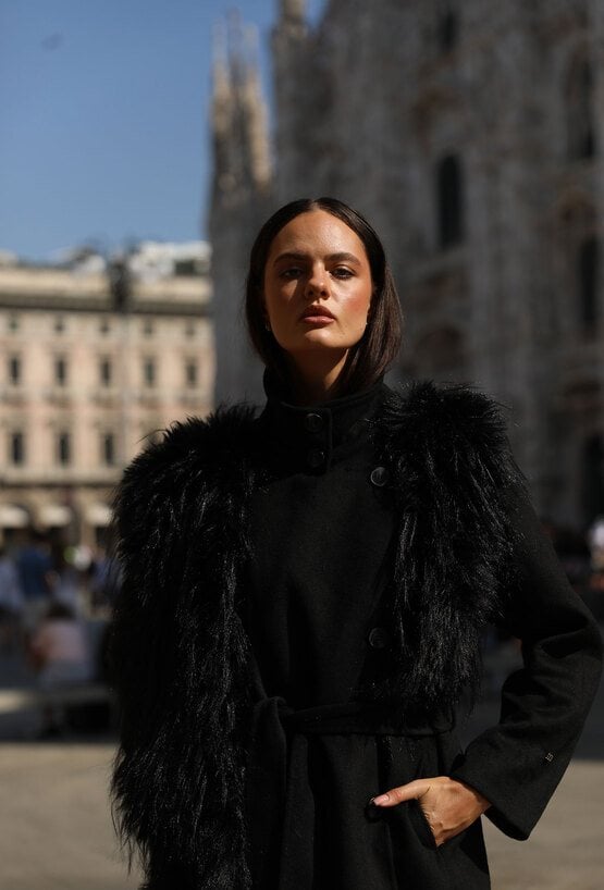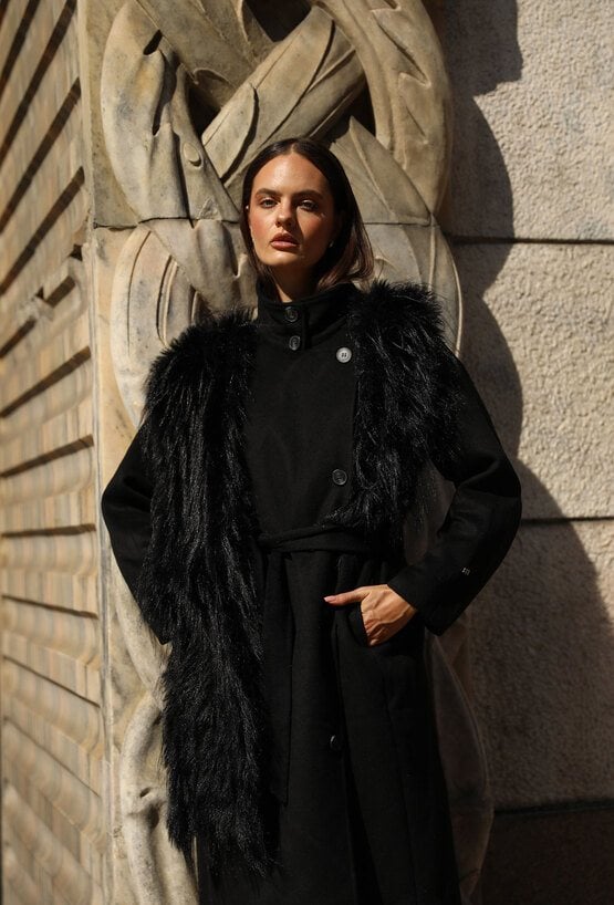 Elegancki płaszcz damski o klasycznym kroju, wykonany z wysokiej jakości wełnianej tkaniny. Płaszcz zapinany na guziki, z wiązaniem w talii, które subtelnie podkreśla sylwetkę. Uwagę przyciąga efektowne, długie futerko przy kołnierzu - odpinane, co pozwala na różnorodne stylizacje w zależności od okazji. Klasyczna długość i ponadczasowy fason czynią go idealnym wyborem na sezon jesienno-zimowy. Modelka na zdjęciu ma 177 cm wzrostu i prezentuje rozmiar 36.