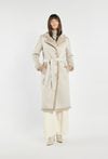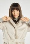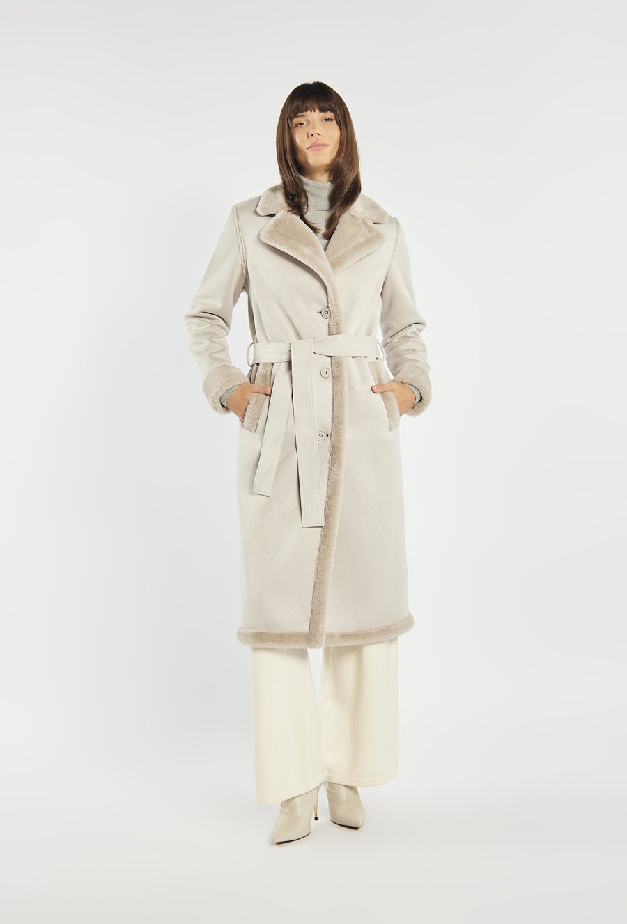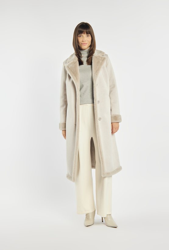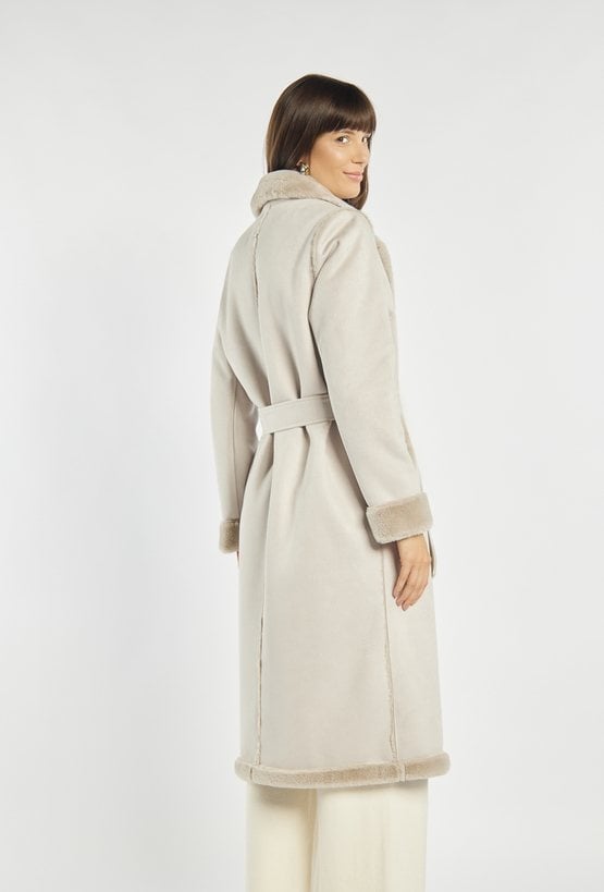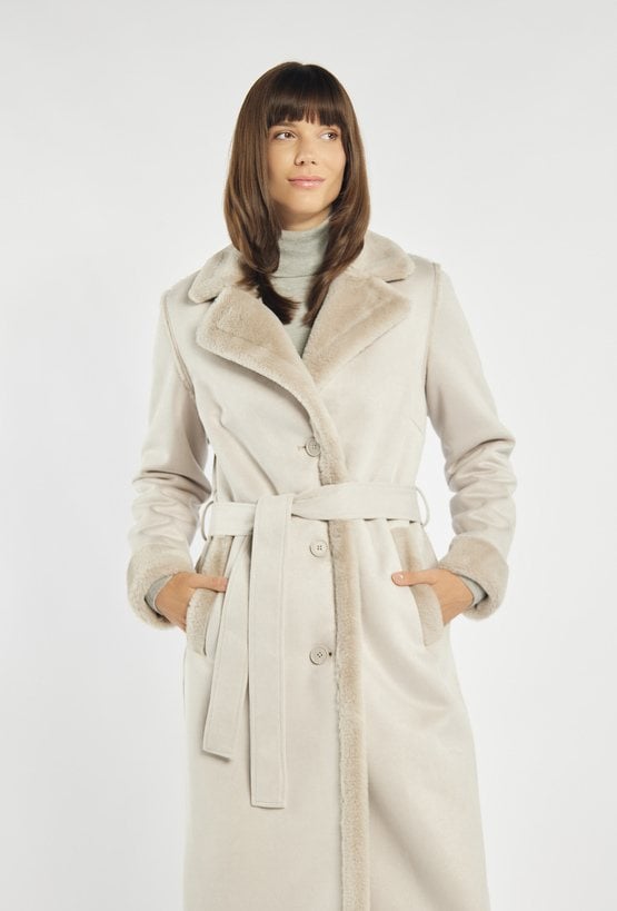 Elegancki płaszcz damski o długości midi. Klasyczny fason z kołnierzem i zapięciem na guziki został uzupełniony paskiem w talii, który podkreśla sylwetkę. Wykończenie imitujące futerko na kołnierzu, mankietach i krawędziach dodaje całości przytulnego, zimowego charakteru. Płaszcz ten jest idealny na chłodniejsze dni. Modelka na zdjęciu ma 177 cm wzrostu i prezentuje rozmiar 36.