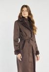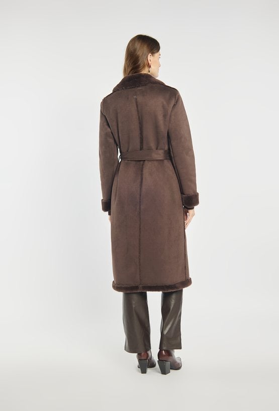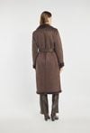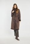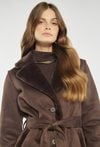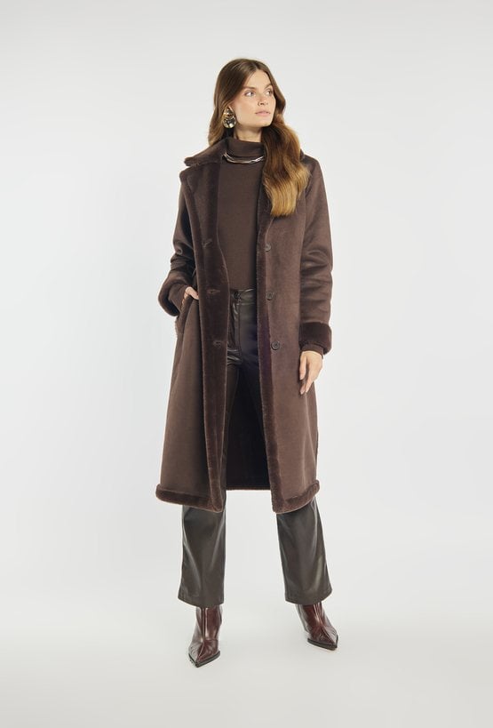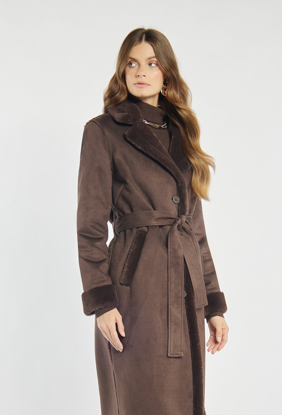 Elegancki płaszcz damski o długości midi. Klasyczny fason z kołnierzem i zapięciem na guziki został uzupełniony paskiem w talii, który podkreśla sylwetkę. Wykończenie imitujące futerko na kołnierzu, mankietach i krawędziach dodaje całości przytulnego, zimowego charakteru. Płaszcz ten jest idealny na chłodniejsze dni. Modelka na zdjęciu ma 177 cm wzrostu i prezentuje rozmiar 36.