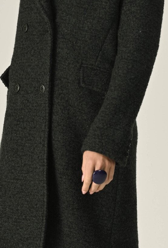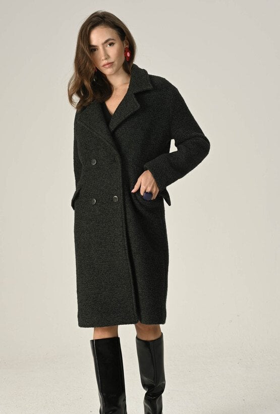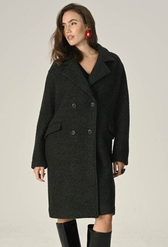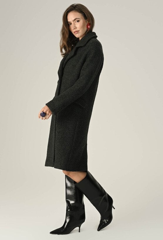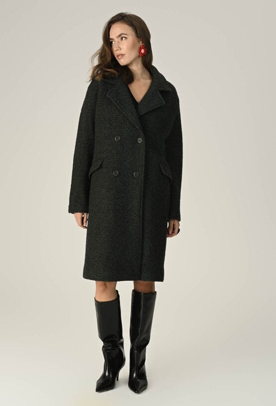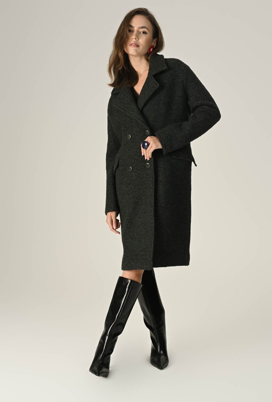 Klasyczny płaszcz o prostym kroju. Posiada kołnierz z klapami i praktyczne kieszenie i dwurzędowe guziki. Charakteru dodaje mu melanżowy kolor w odcieniu brązu, który sprawdzi się zarówno w casualowych, jak i w wizytowych stylizacjach na różne okazje. Modelka na zdjęciu ma 174 cm wzrostu i prezentuje rozmiar 36.