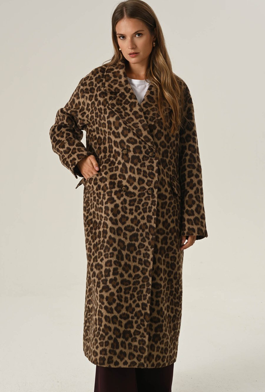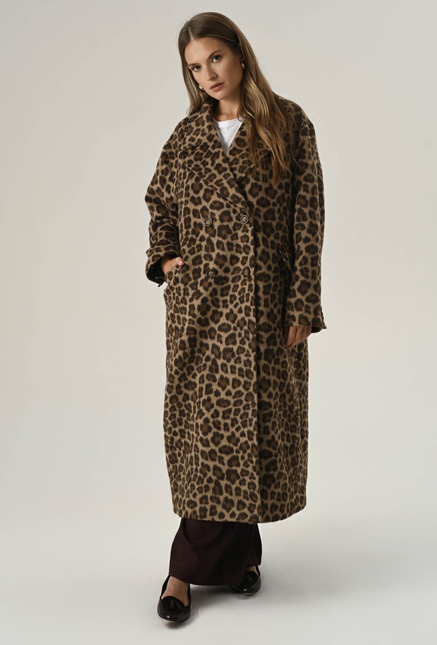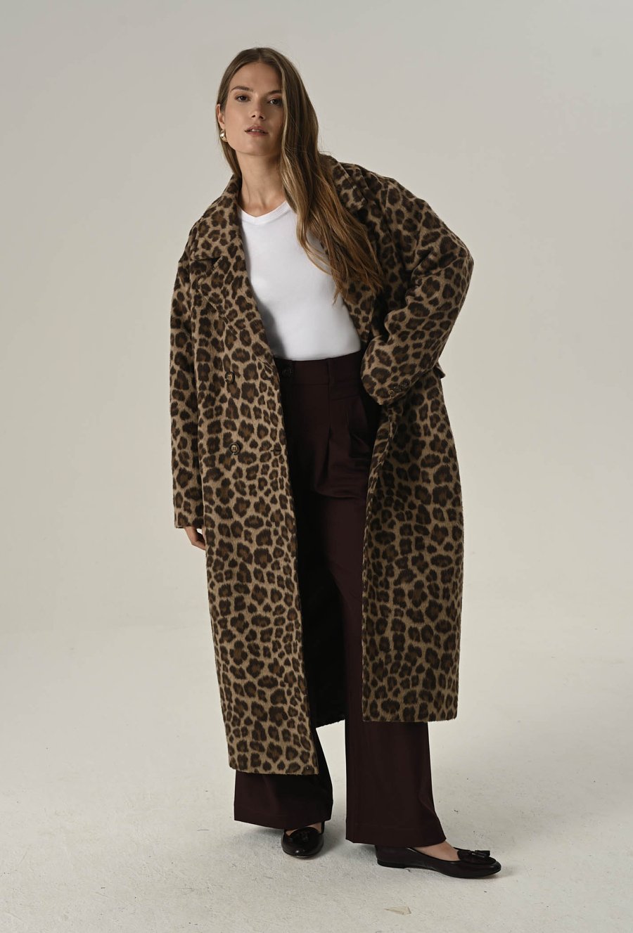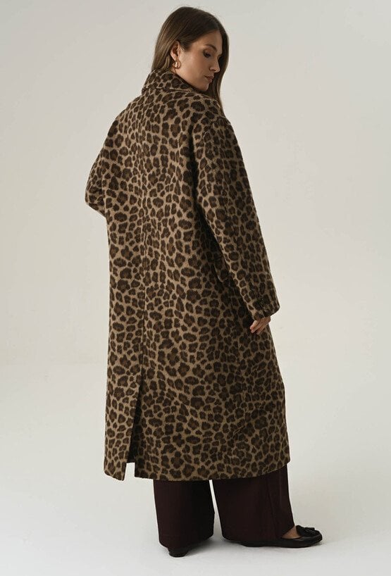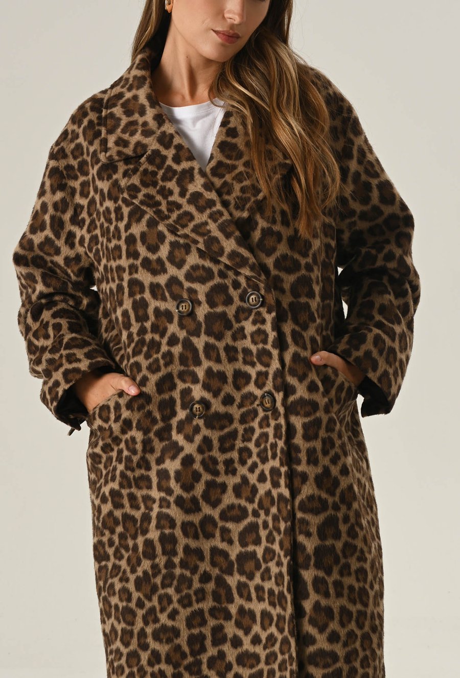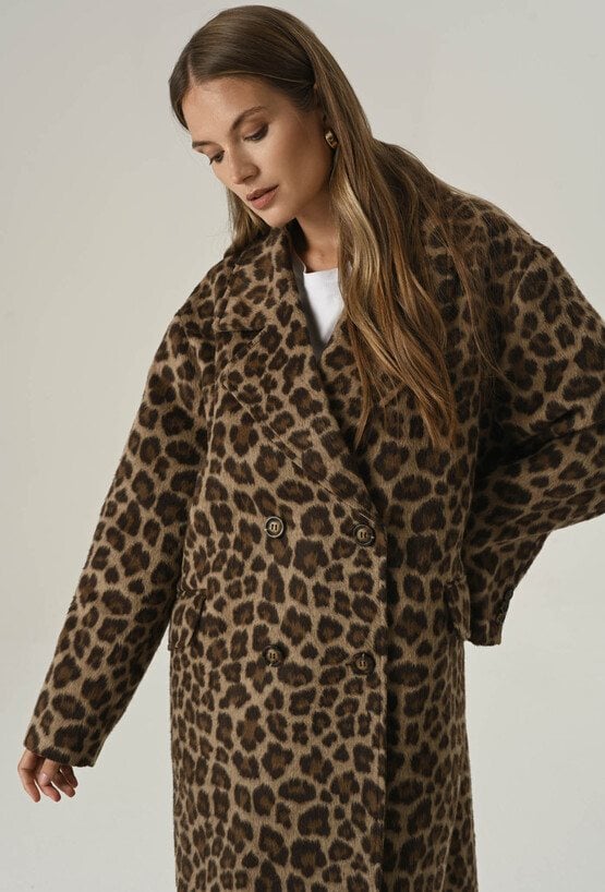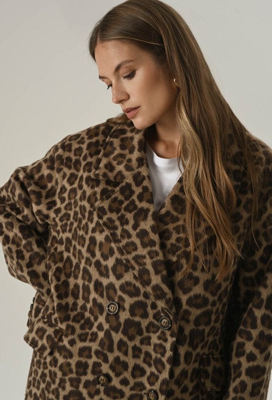 Wyrazisty styl na chłodne dni! Długi, oversizowy płaszcz w modny print panterki to to absolutny must have tego sezonu. To propozycja dla kobiet, które lubią przyciągać spojrzenia. Klasyczne zapięcie na guziki, praktyczne kieszenie na wysokości bioder oraz elegancki, duży kołnierz nadają całości szyku. Dzięki podszewce płaszcz jest komfortowy i idealny na przejściowe sezony. Postaw na modę z pazurem! Modelka na zdjęciu ma 175 cm wzrostu i prezentuje