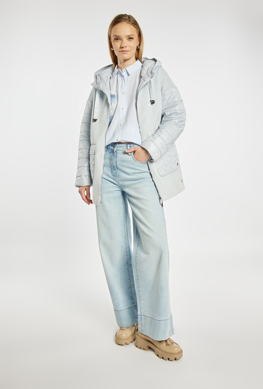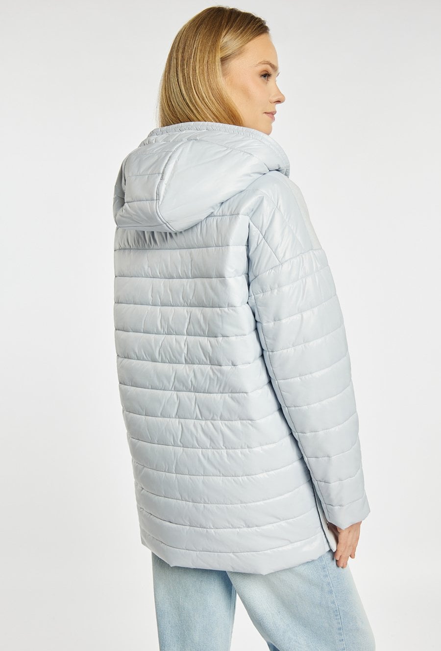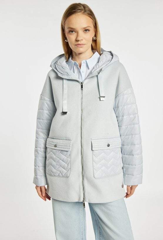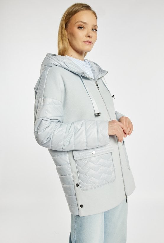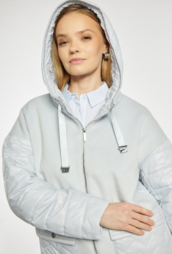Płaszcz damski o nowoczesnym, casualowym charakterze, wykonany z przyjemnego w dotyku materiału. Płaszcz z kapturem i zapięciem na zamek łączy gładką formę z pikowanymi rękawami oraz kieszeniami, co nadaje całości modnego, miejskiego stylu. Model doskonale sprawdzi się w sezonie przejściowym, zapewniając komfort i swobodę noszenia. Modelka na zdjęciu ma 177 cm wzrostu i prezentuje rozmiar 36.