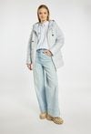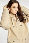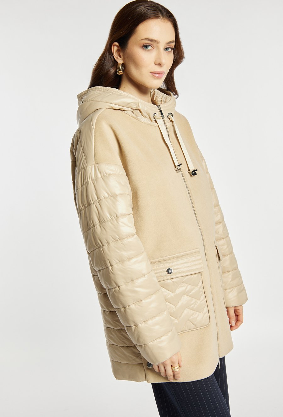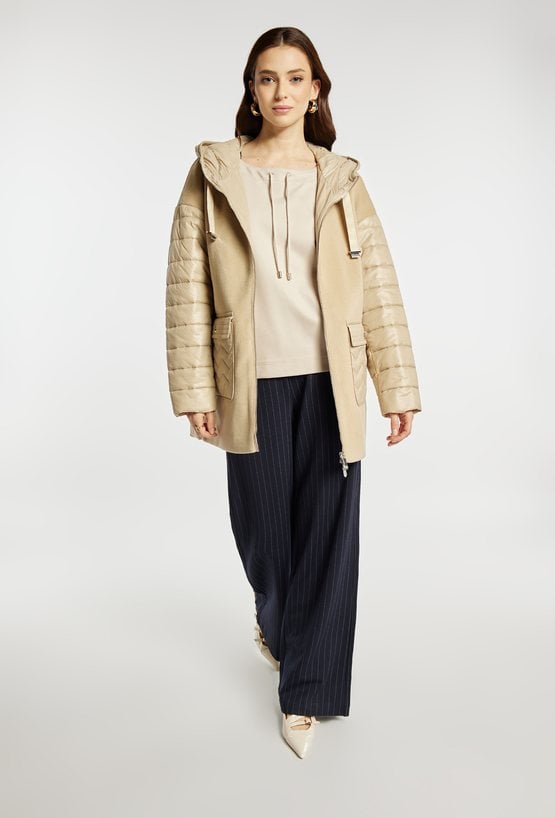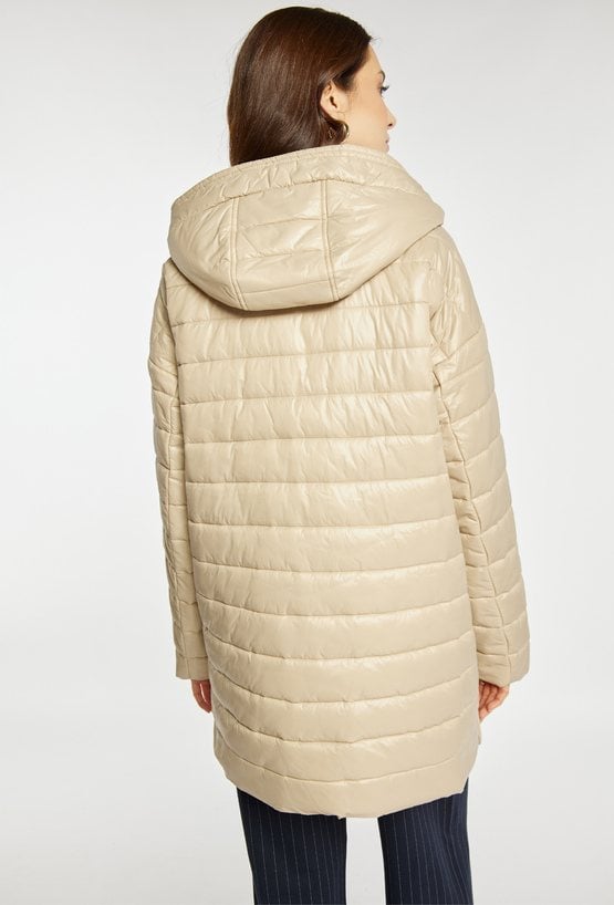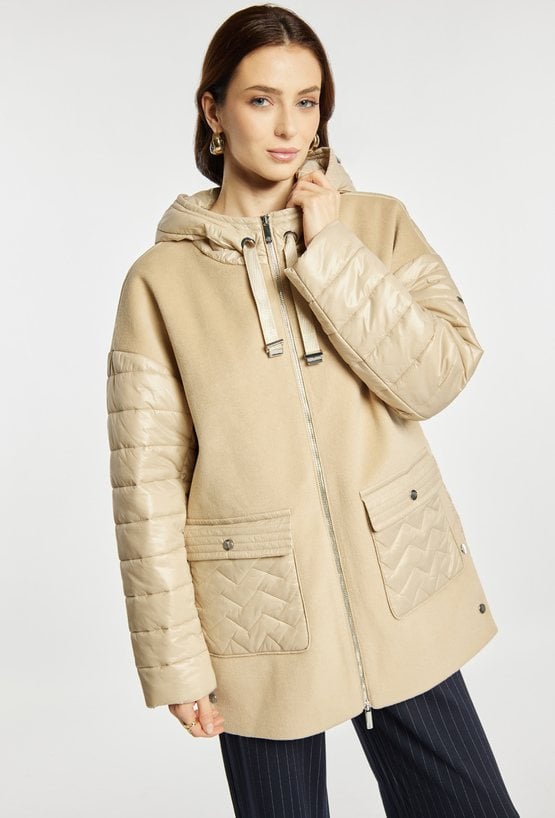 Płaszcz damski o nowoczesnym, casualowym charakterze, wykonany z przyjemnego w dotyku materiału. Płaszcz z kapturem i zapięciem na zamek łączy gładką formę z pikowanymi rękawami oraz kieszeniami, co nadaje całości modnego, miejskiego stylu. Model doskonale sprawdzi się w sezonie przejściowym, zapewniając komfort i swobodę noszenia. Modelka na zdjęciu ma 177 cm wzrostu i prezentuje rozmiar 36.