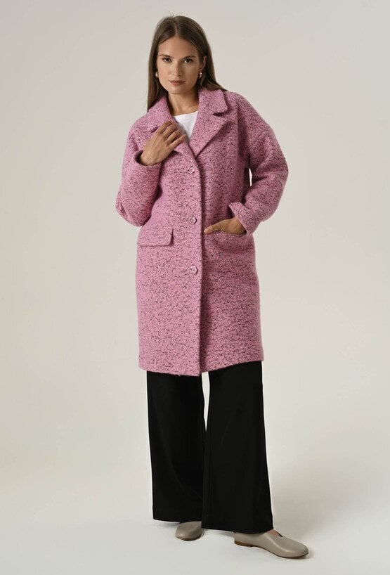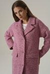 Płaszcz o prostym kroju wykonany z wysokiej jakości dzianiny z domieszką wełny . Długość nad kolano, lekko obniżona linia ramion. Delikatna jodełka nadaje mu charakteru. Model ten idealnie sprawdzi się do każdej stylizacji zarówno tej bardziej casualowej jak i sportowej. Modelka na zdjęciu ma 175 cm wzrostu i prezentuje