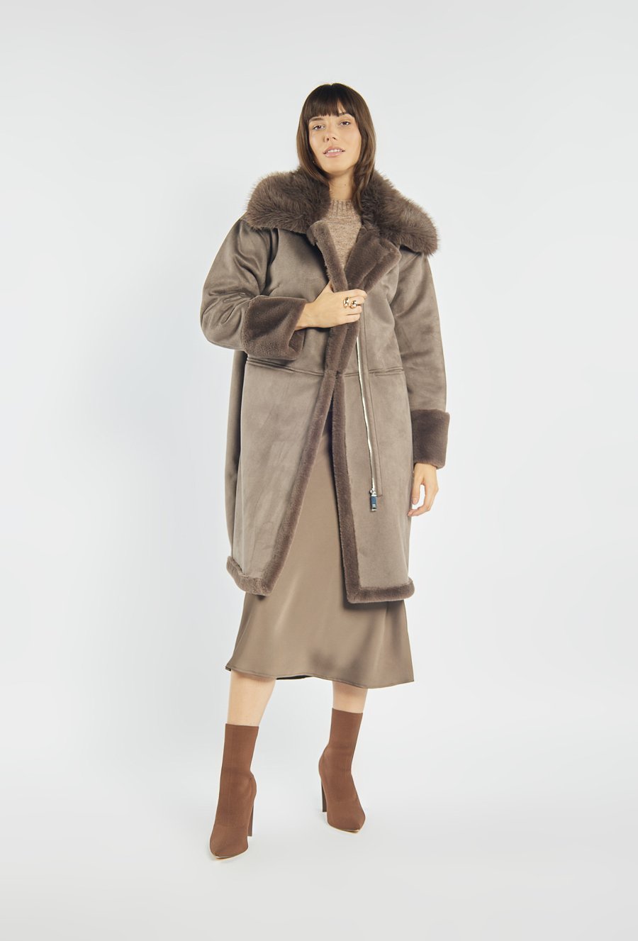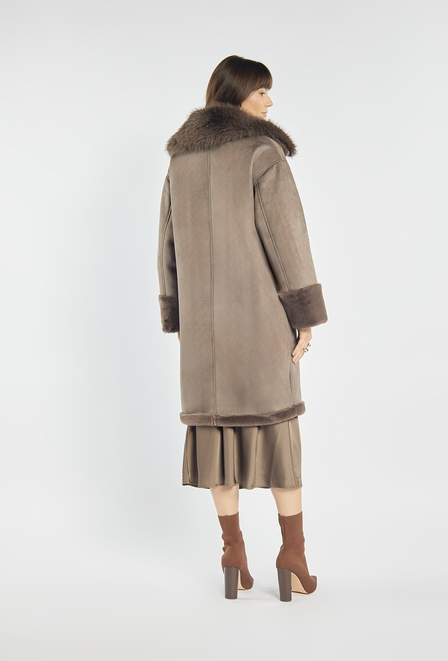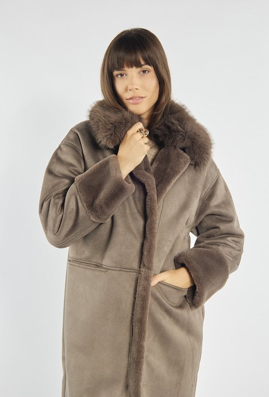 Stylowy płaszcz damski wykończony miękkim futerkiem, które nadaje całości elegancji i klasy. Model zapinany na suwak, z praktycznymi kieszeniami po bokach, świetnie sprawdzi się w chłodniejsze dni. Odpinane futerko pozwala na dopasowanie stylizacji do okazji i pogody, czyniąc płaszcz uniwersalnym wyborem na co dzień i na wyjątkowe wyjścia. Modelka na zdjęciu ma 177 cm wzrostu i prezentuje rozmiar 36.